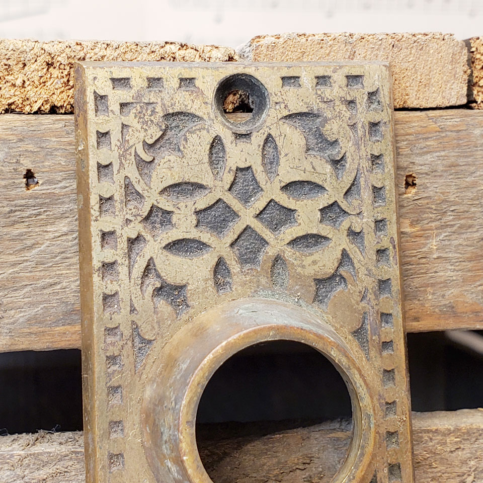 Antique architectural salvage cast bronze Chicago Niles Hardware Co. Tunis pattern doorknob backplate circa 1895 measuring approx. 1 3/4" wide x 5 3/8" tall with a 7/8" diameter collar. The spindle and keyhole measure 2 1/4" on center. Sold individually. Condition may vary. Priced at $45/each.