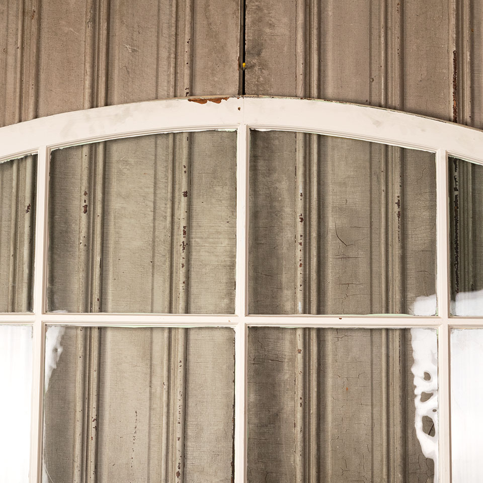 Antique architectural salvage arched top school classroom divided 8 lite transom window with original wavy glass measuring approx. 76 5/8" wide x 40 5/8" tall x 1 3/4" thick. See photos to evaluate condition.