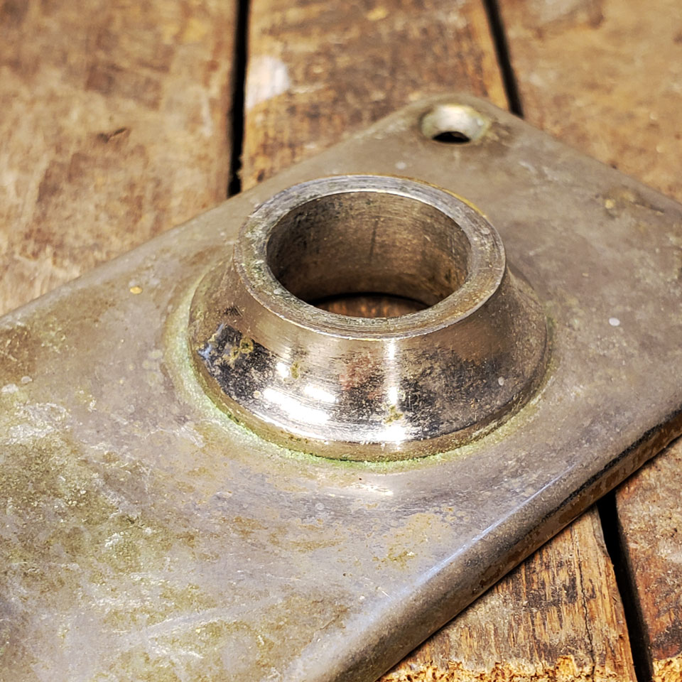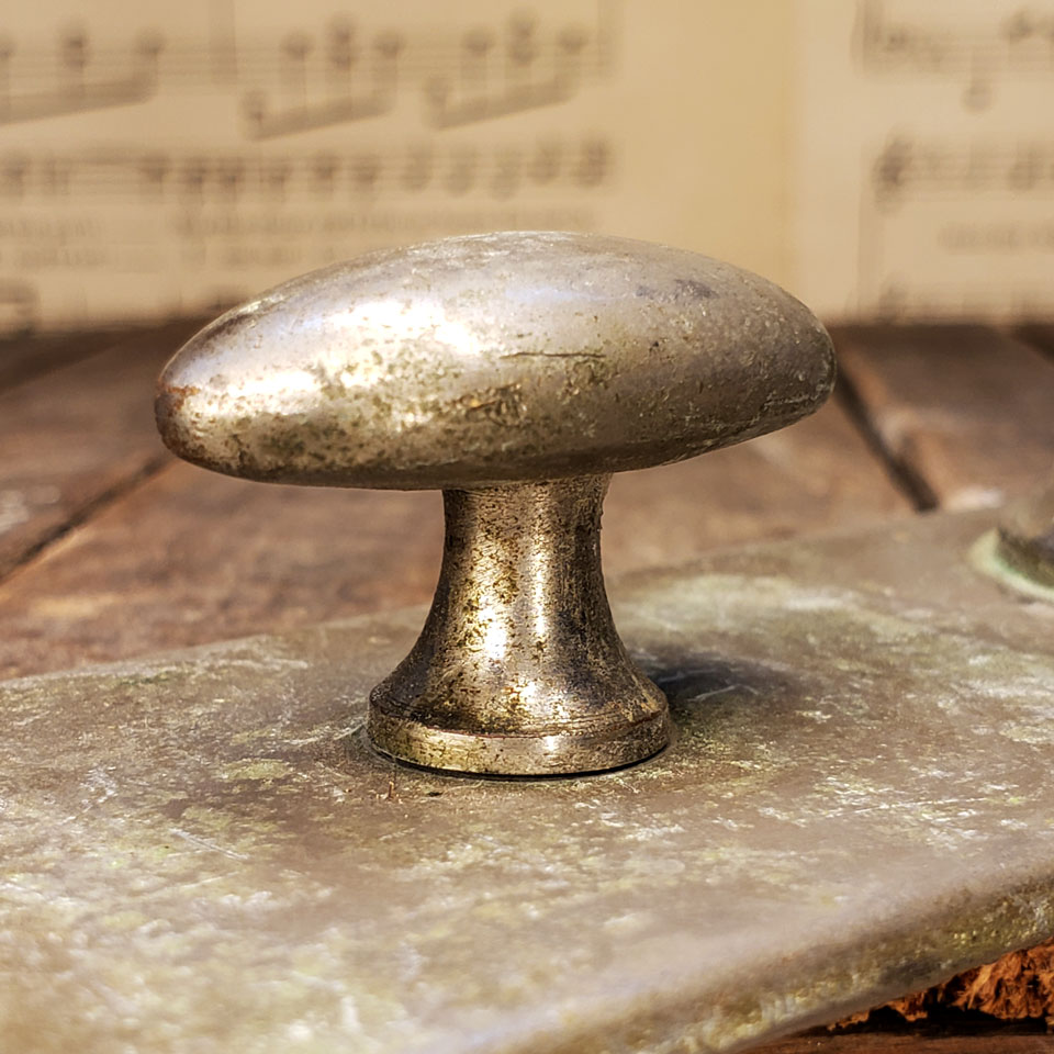 Antique architectural salvage nickel plated brass interior doorknob backplate with mortise latch deadbolt thumb turn measuring approximately 2" wide x 5 3/4" tall x 2" front to back with a 3/4" diameter collar. The thumb turn and spindle measure 2 1/2" on center.