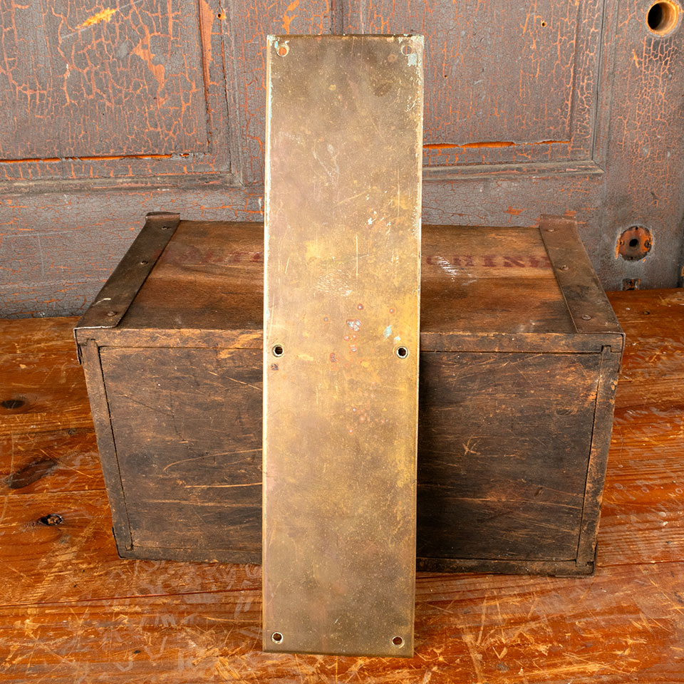 Antique architectural salvage heavy brass Yale & Towne door push plate with beveled edges measuring approx. 4" x 16" and 1/16" thick. Color and condition may vary, see photos to evaluate. Priced at $75/each.