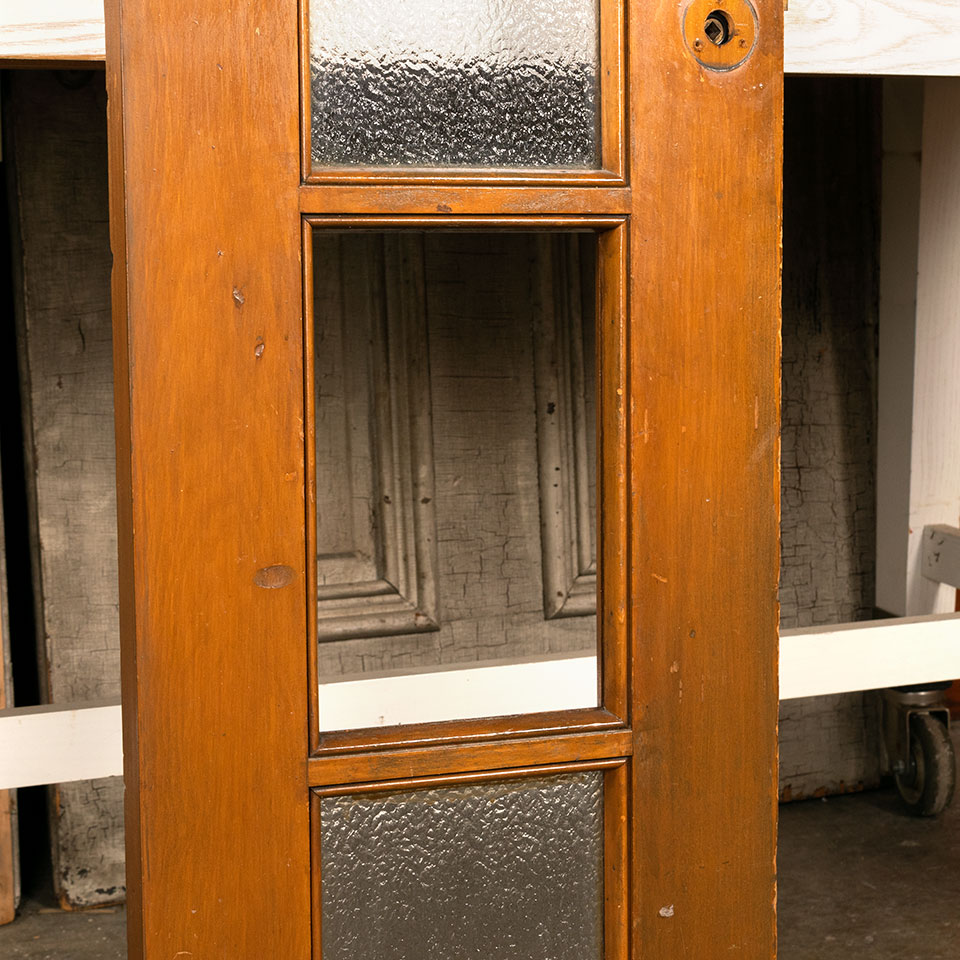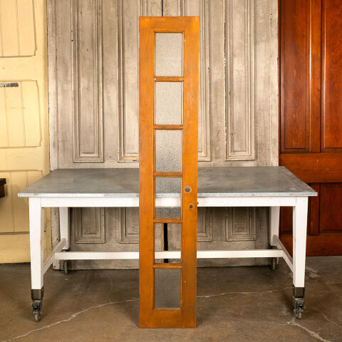 Vintage 6 lite wood school classroom closet/cabinet door with mortise lock and texture glass panels measuring approx. 13 7/8" wide x 74 1/4" tall x 1 1/4" thick. There's one missing pane of glass. See photos to evaluate condition.