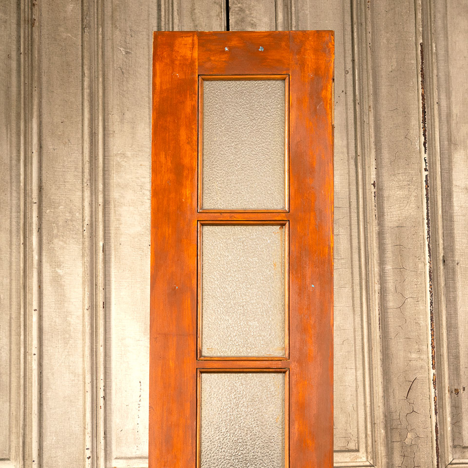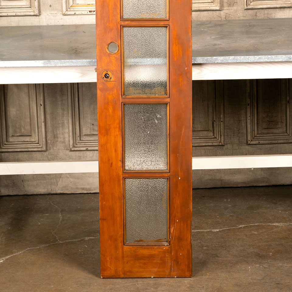 Vintage 6 lite wood school classroom closet/cabinet door with mortise lock and texture glass panels measuring approx. 13 7/8" wide x 74 7/8" tall x 1 1/4" thick. See photos to evaluate condition.