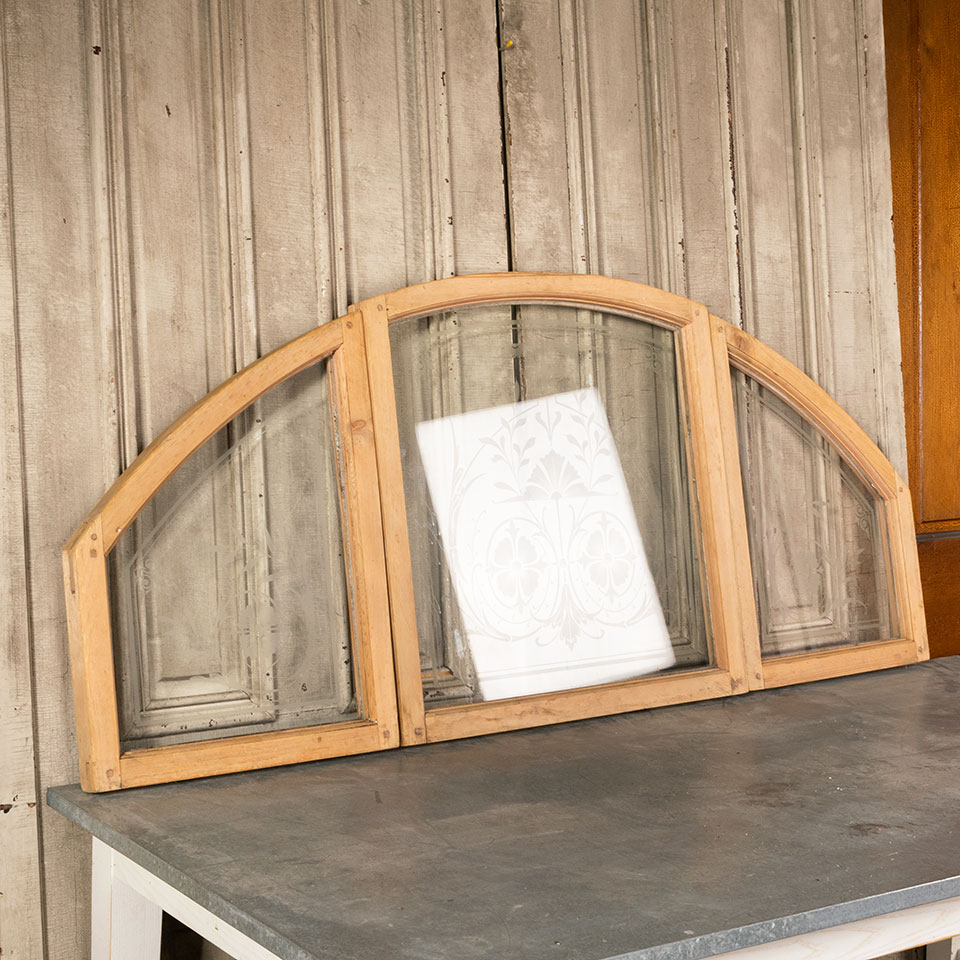 Antique architectural salvage 3-piece arched transom window with etched glass measuring approx. as follows: left panel 18 15/16" wide x 13" & 16" tall x 2" thick; middle panel 27 3/8" wide x 26 1/2" & 28 5/8" tall x 2" thick; right panel 18 15/16" wide x 13" & 16" tall x 2" thick. The etched glass appears to have been added at some point in the window's history. There's a chip in the bottom corner of the left panel. See photos to evaluate condition. Priced at $1,150 for the 3-piece set.