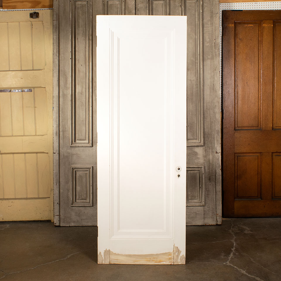 Antique architectural salvage painted wood 1 panel interior door measuring approx. 29 5/8" wide x 83" tall x 1 3/8" thick. There's veneer damage along the bottom of both sides of the door. See photos to evaluate condition.