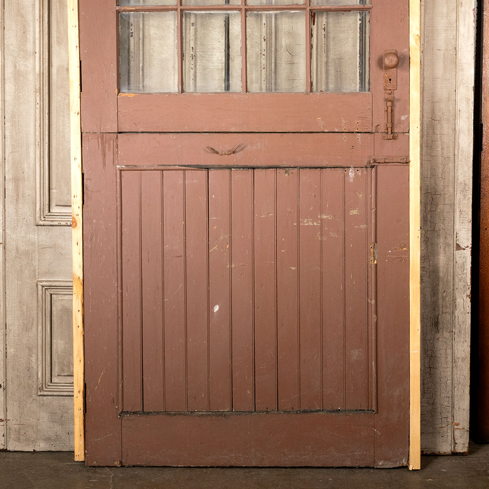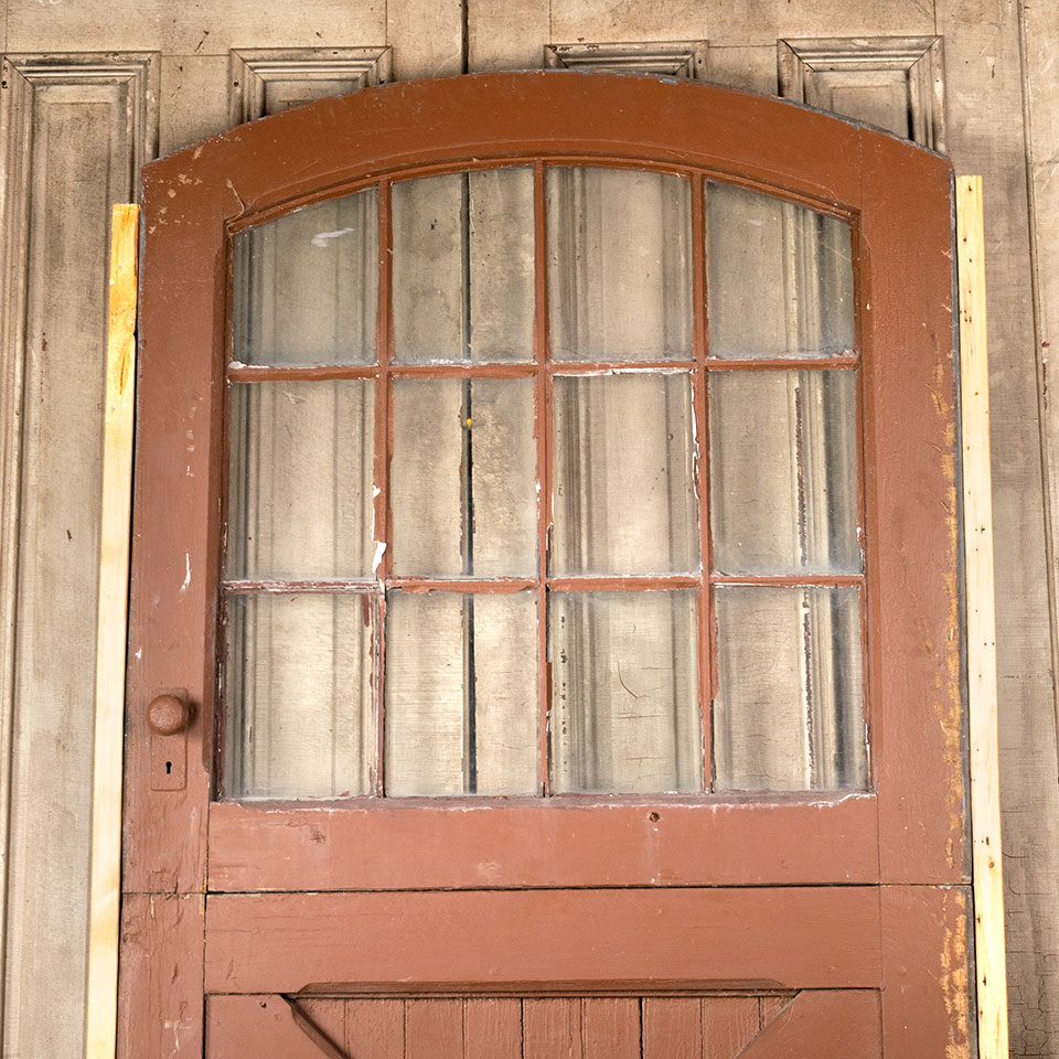 Antique architectural salvage arched top 12 lite wood carriage house / horse barn Dutch door measuring approx. 47 3/8" wide x 96 3/4" tall (at center) x 2 3/4" thick. The top and bottom are each approx. 48" tall. See photos to evaluate condition.