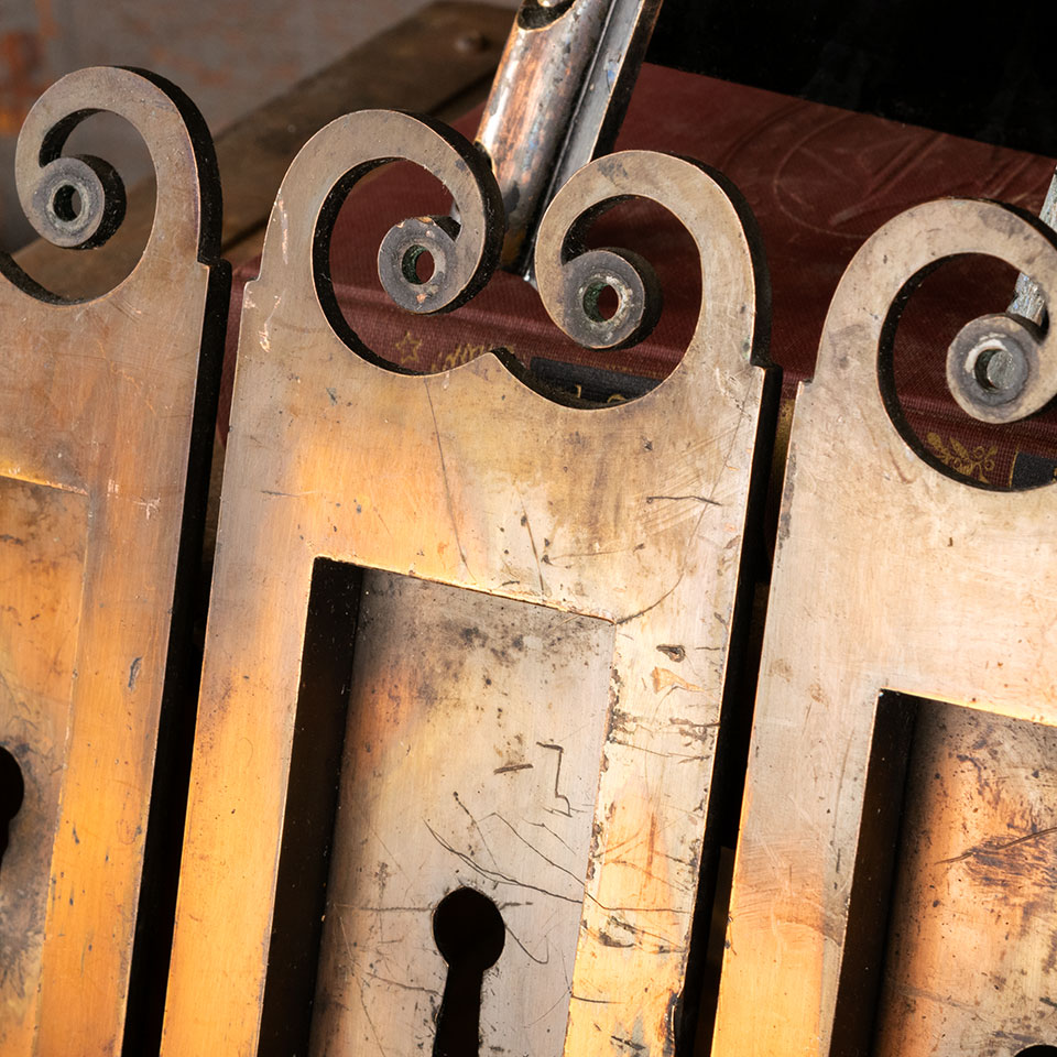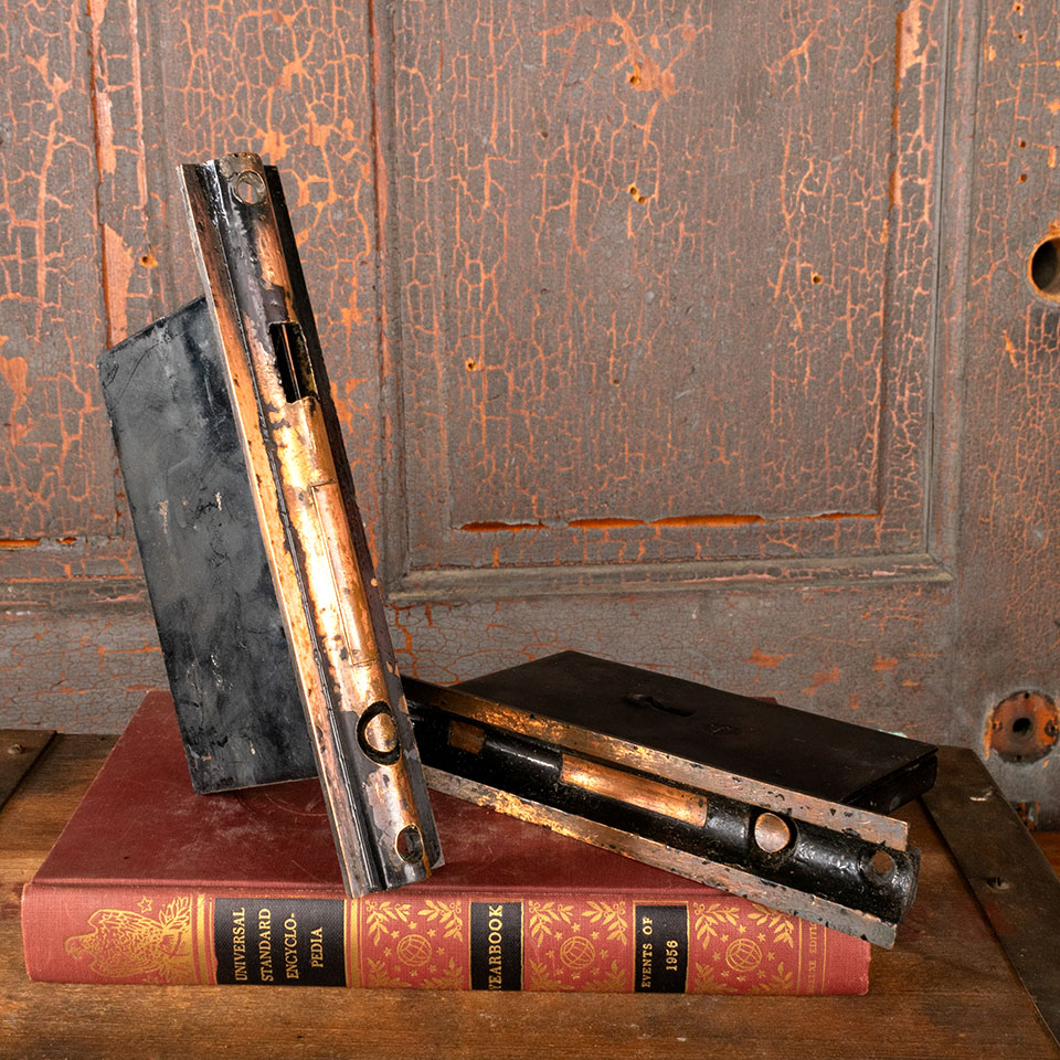 Antique architectural salvage pocket door hardware pulls and locks set. The set includes 4 cast bronze pulls with a japanned finish (approx. 2 3/4" wide x 8" tall with a 1 3/4" wide x 4 1/2" tall recessed area), 2 mortise locks with pop-out finger pulls (faceplates: 1 1/4" wide x 7 5/8" tall; mortise bodies: 5/8" wide x 5 1/4" tall one with a 3 3/4" overall back set and the other with a 3 3/8" overall backset). See photos to evaluate condition. Sold as set. Priced at $450 for the 6 piece set.