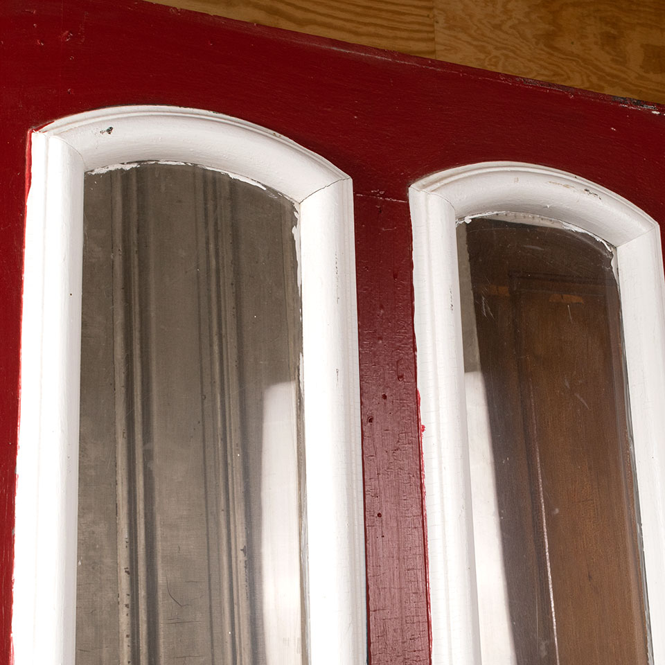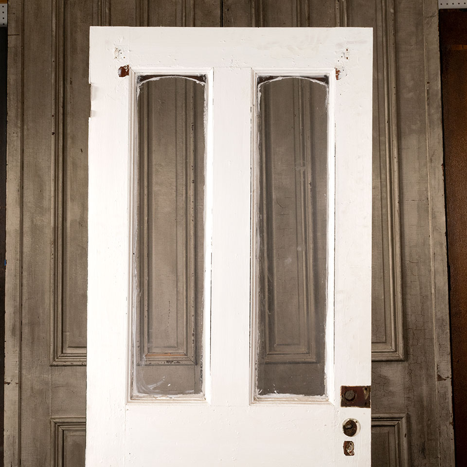 Antique architectural salvage 2 lite painted wood entry door measuring approx. 33 5/8" wide x 81 1/2" tall x 1 1/2" thick. The 2 panes of glass have been replaced with plexiglass at some point in it's history. See photos to evaluate condition.
