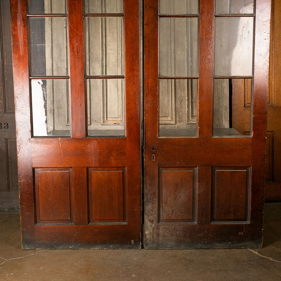 Pair of oversized antique architectural salvage paneled wood interior doors with divided lite glass windows together measuring approx. 76 3/4" wide x 95 5/8" tall x 1 3/4" thick. One of the doors has missing, cracked, and replaced glass panes. See photos to evaluate condition. Priced at $4,500 for the pair.