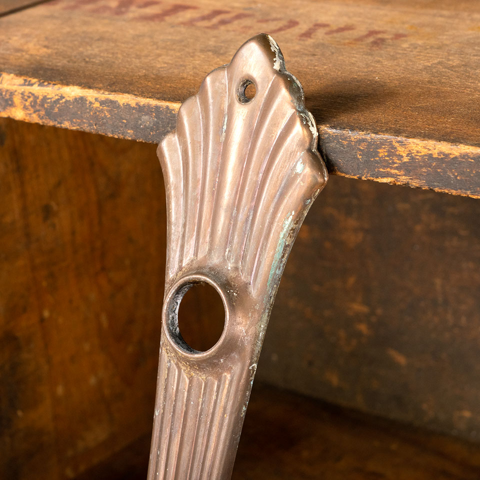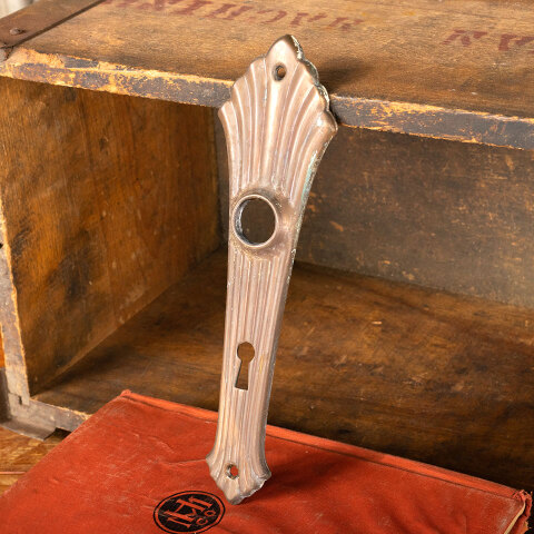 Antique architectural salvage Art Deco style metal interior doorknob backplate hardware measuring approx. 2 1/8" wide x 7 1/2" tall with a 7/8" diameter collar and skeleton keyhole. The spindle and keyhole measure 2 1/2" on center. Color and condition may vary, see photos to evaluate. Sold individually at $18/each.