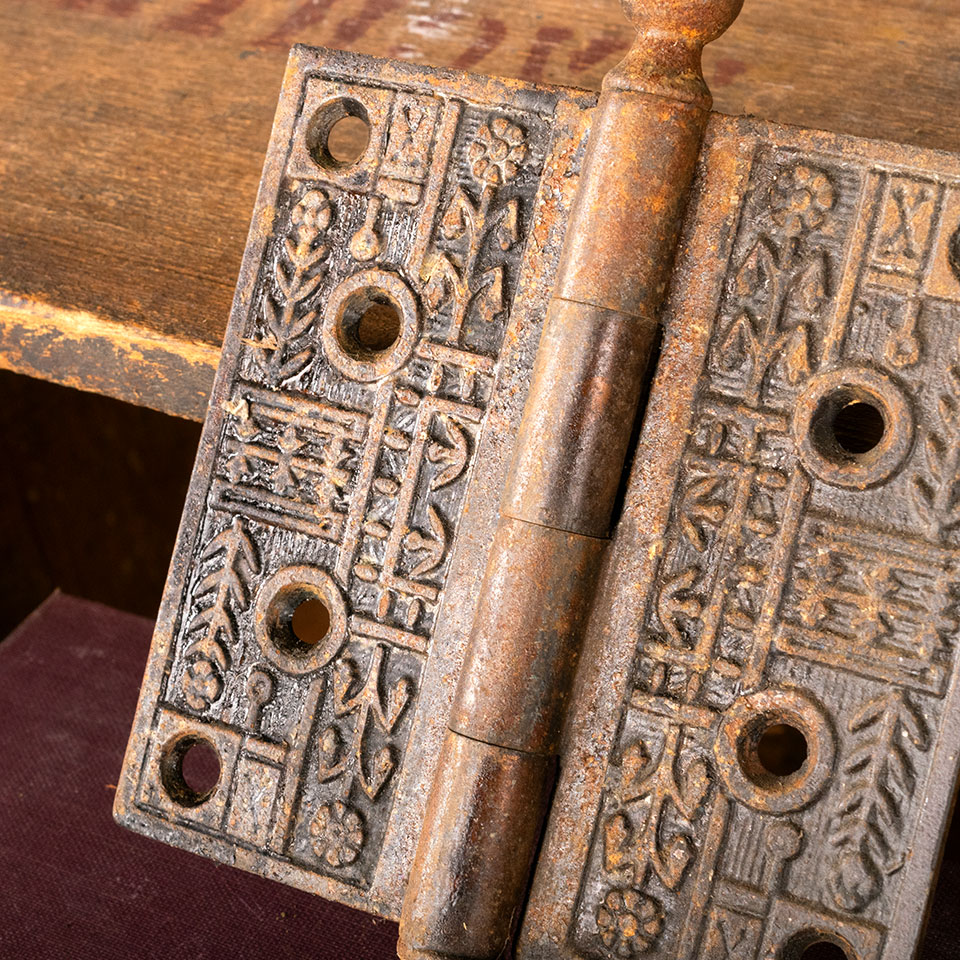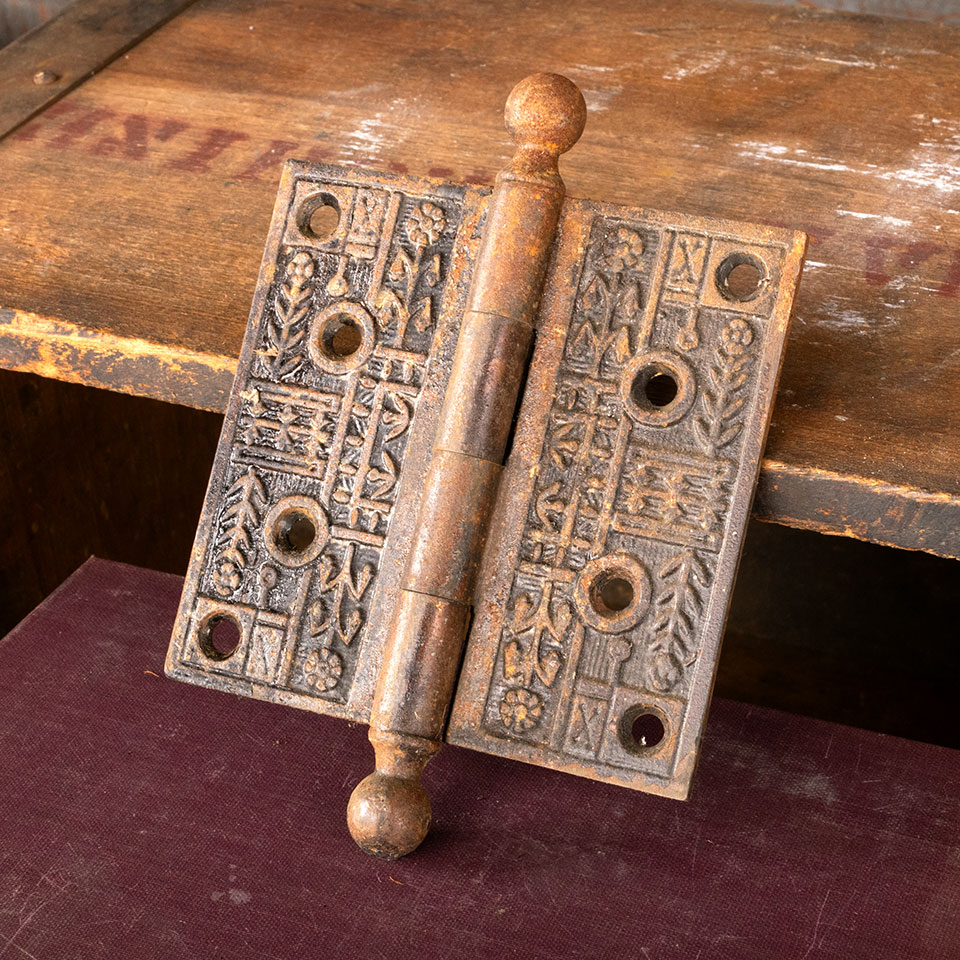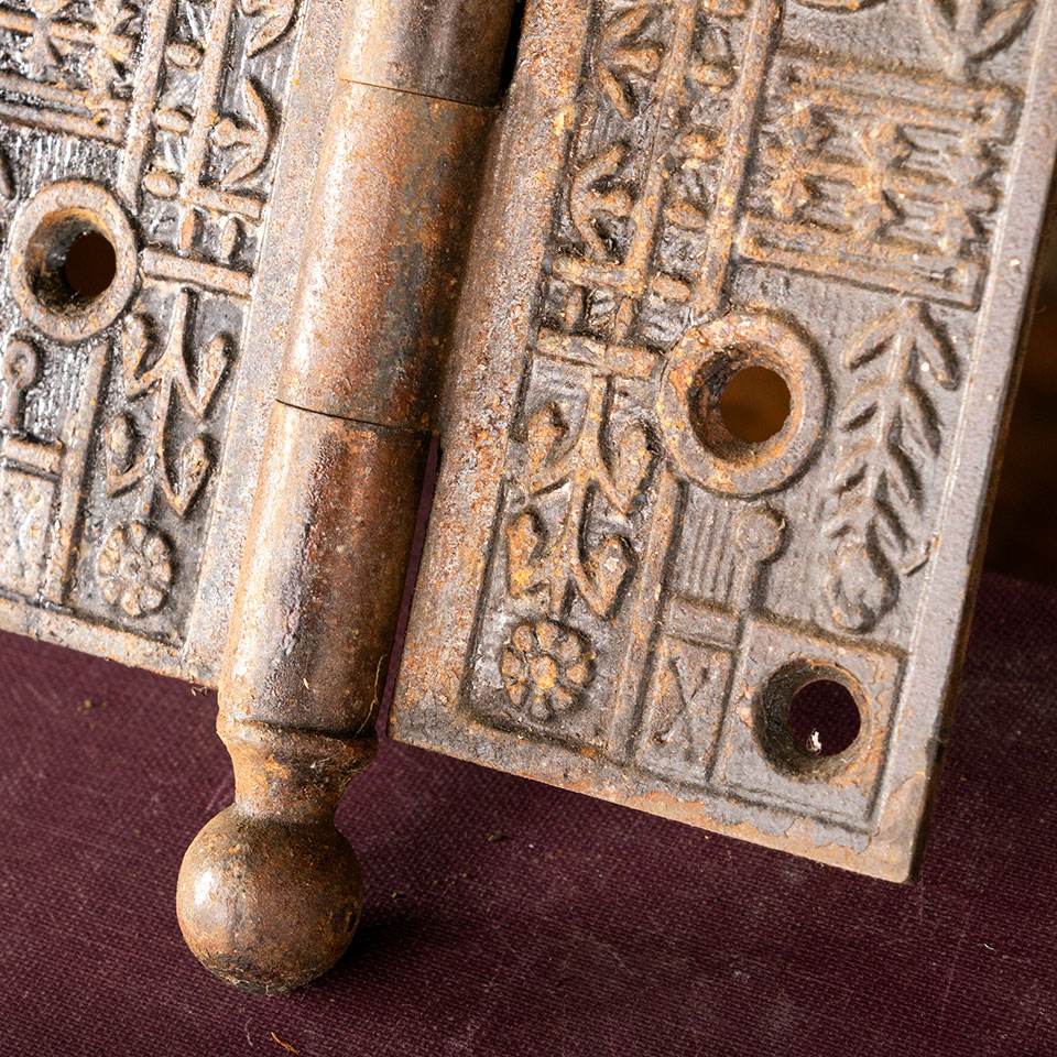 Antique architectural salvage ornate Victorian Eastlake cast iron interior ball finial butt door hinge measuring 4" square (5 1/2" including finials). Color and condition may vary, see photos to evaluate. Priced at $40/each.