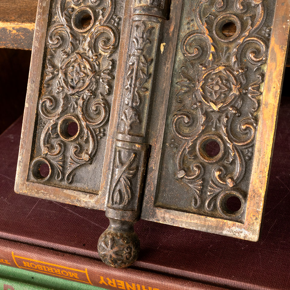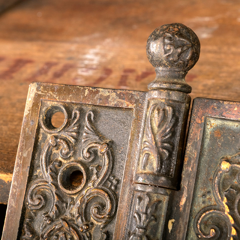 Antique architectural salvage ornate cast iron Russell & Erwin Arabian pattern c. 1897 door hinge with ball finials Japanned finish measuring approx. 4" square (not including the finials). See photos to evaluate condition.