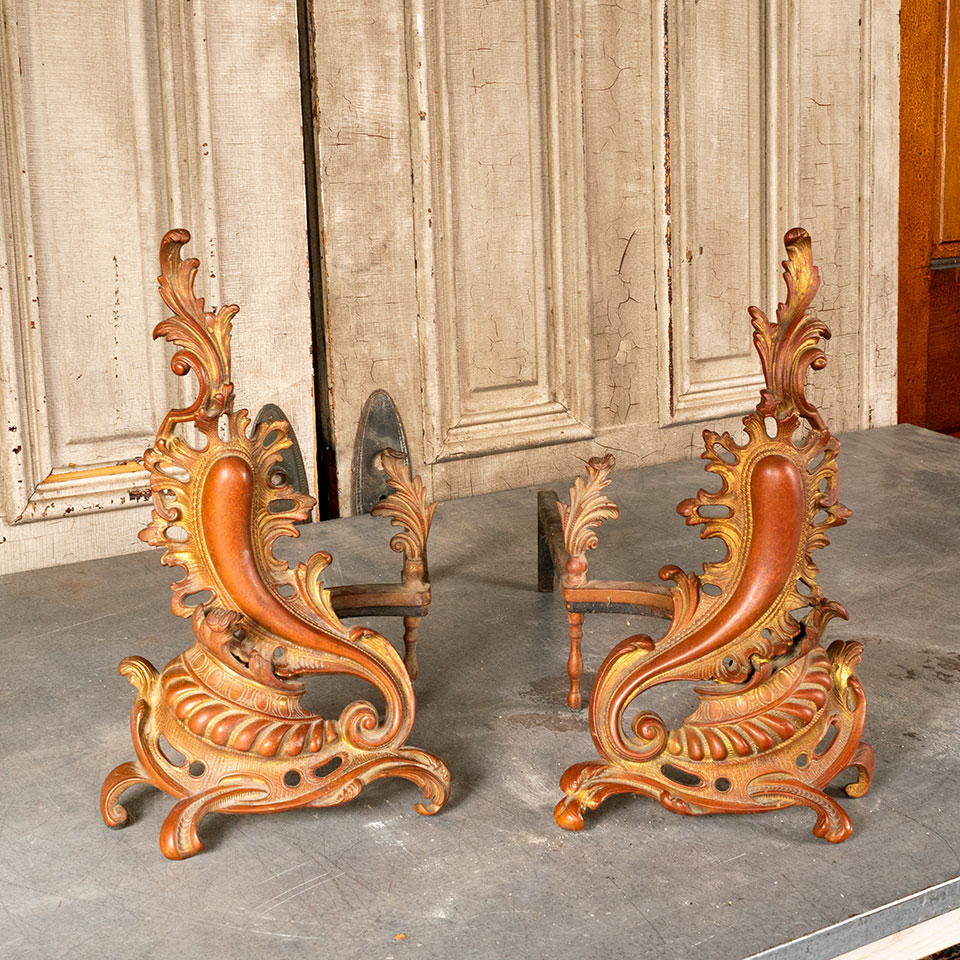 Pair of antique architectural salvage ornate French Rococo style brass fireplace andirons each measuring approx. 10” wide x 16” tall x 22” front to back. See photos to evaluate condition. Priced at $350 for the pair.