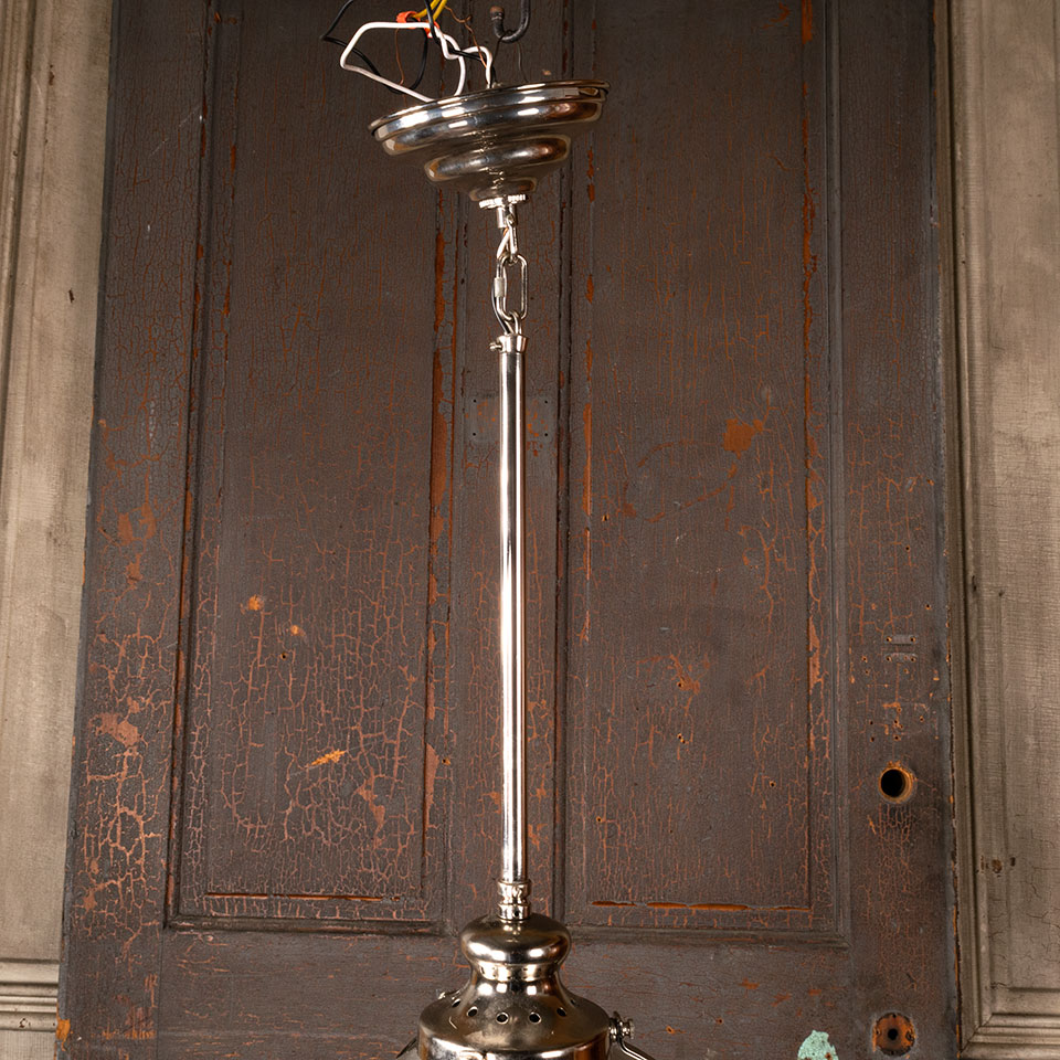 Architectural salvage contemporary industrial style pendant light fixture with chrome finish measuring approx. 14" in diameter x 29" tall. This is not an antique light fixture. See photos to evaluate condition.