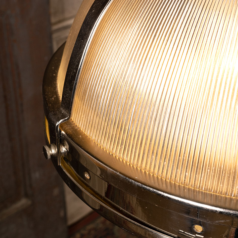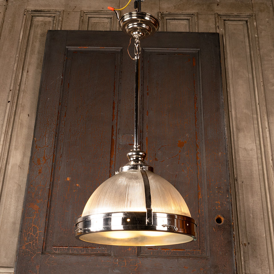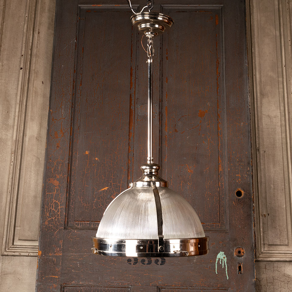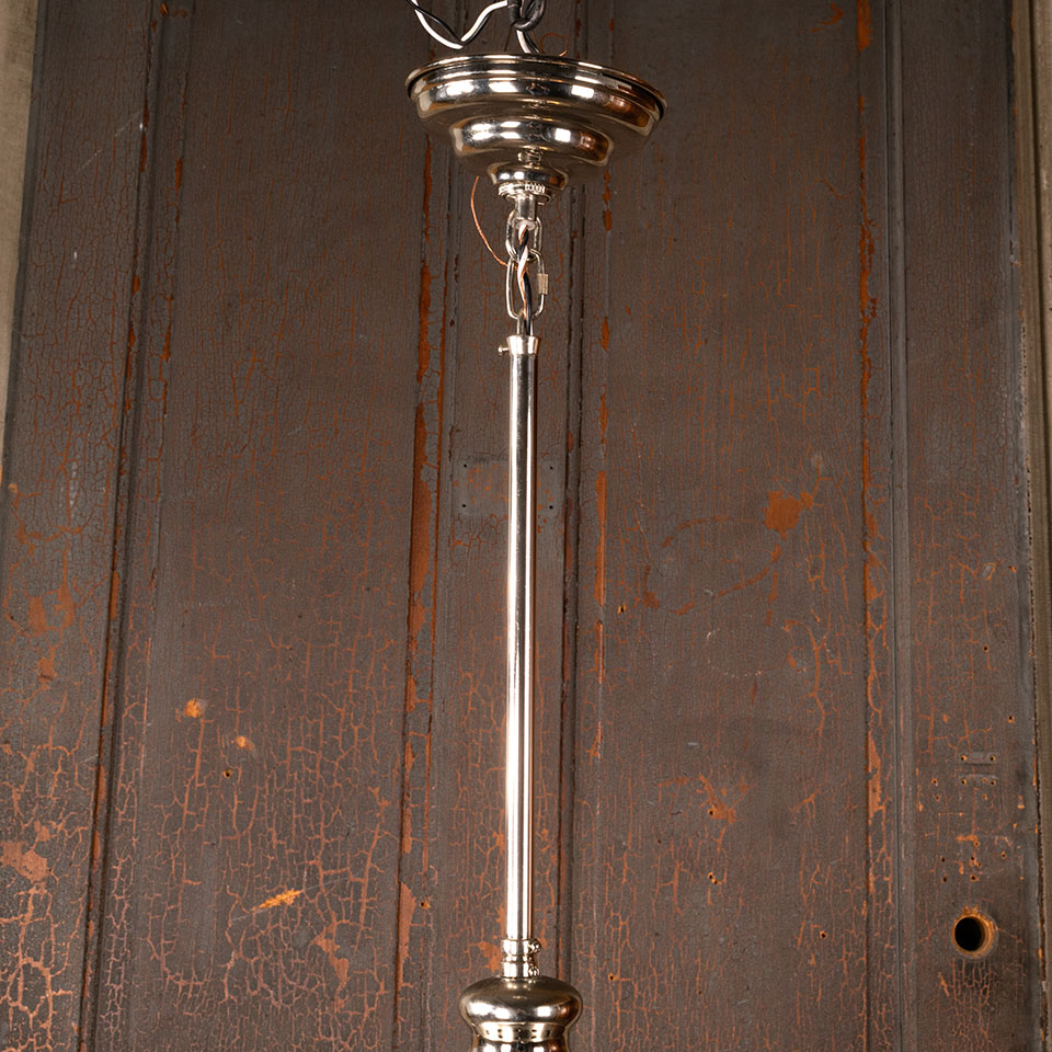 Architectural salvage contemporary industrial style pendant light fixture with chrome finish measuring approx. 14" in diameter x 29" tall. This is not an antique light fixture. See photos to evaluate condition.