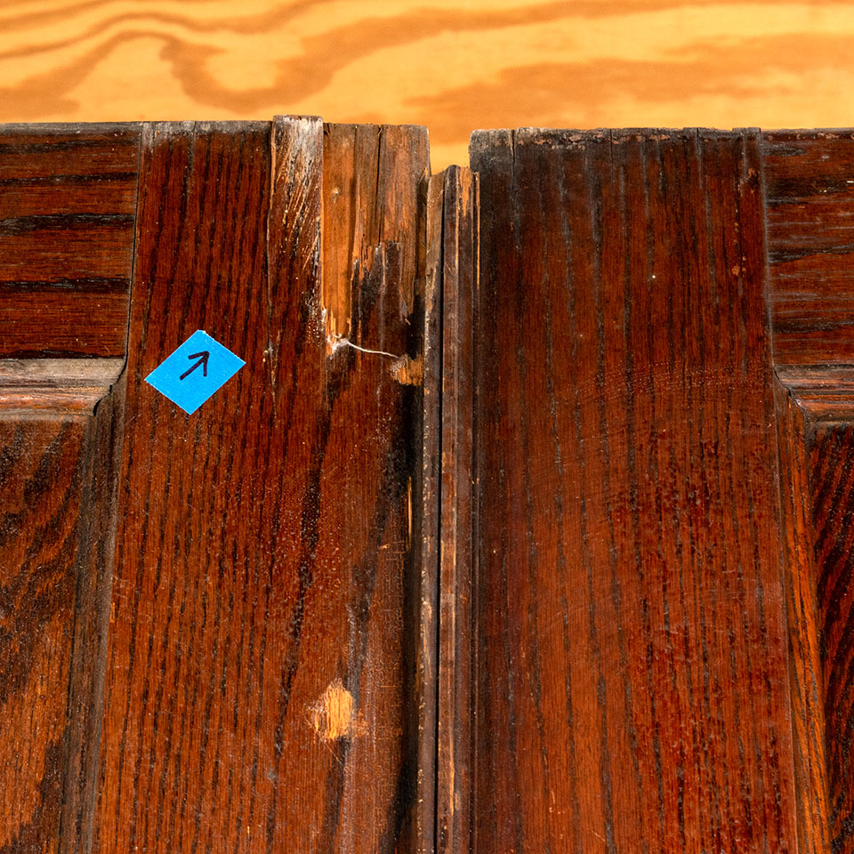 Pair of antique architectural salvage 2 panel oak pocket doors together measuring approx. 60 3/4" wide x 90 1/8" tall x 1 3/4" thick. There's veneer loss on both doors and one of the meeting rail trim pieces is missing. See photos to evaluate condition. Priced at $300 for the pair.
