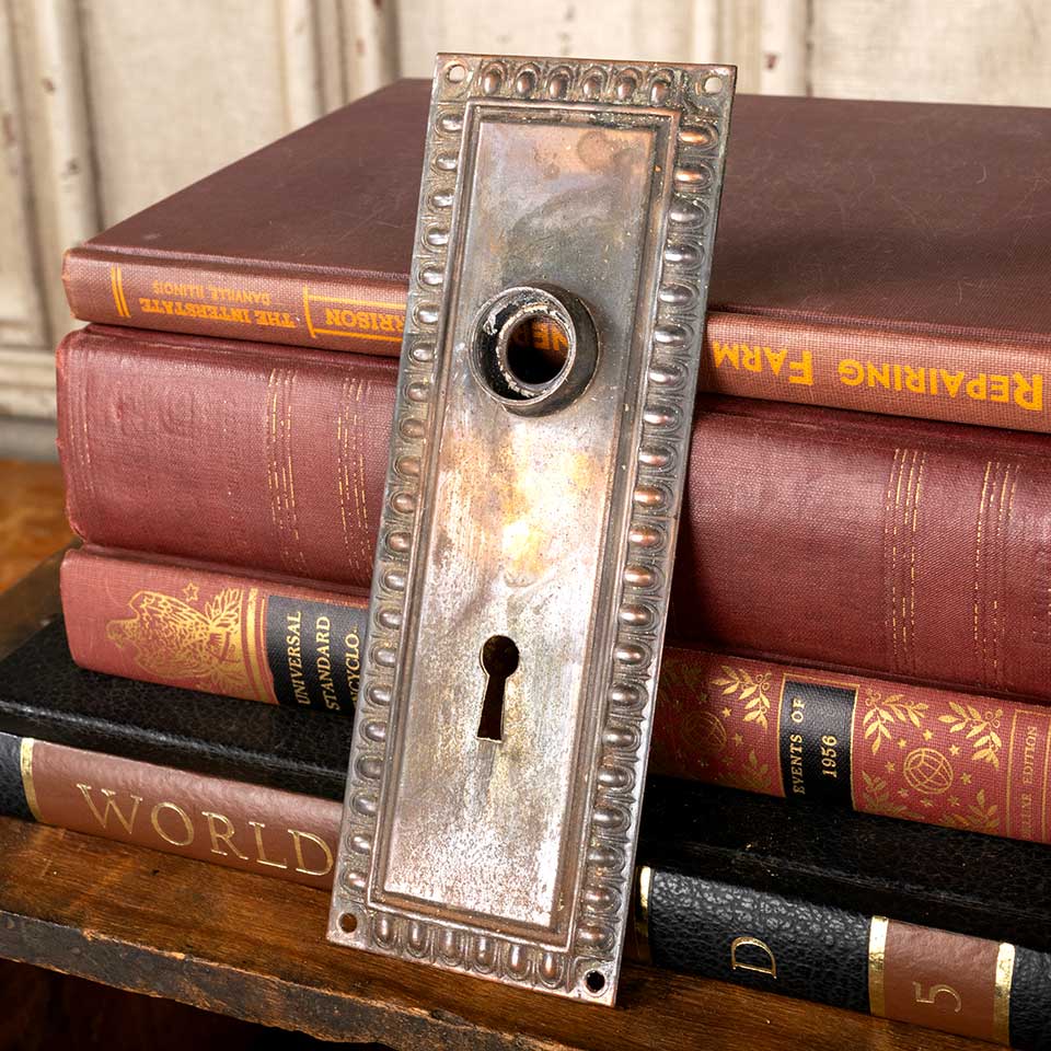 Antique architectural salvage metal doorknob backplate hardware with an egg & dart patterned border measuring approx. 2 3/8" wide x 6 1/2" tall with a 7/8" diameter collar. The spindle and keyhole measure 2 1/2" on centers. Keyhole styles vary. Color and condition vary. See photos to evaluate. Priced at $24/each.