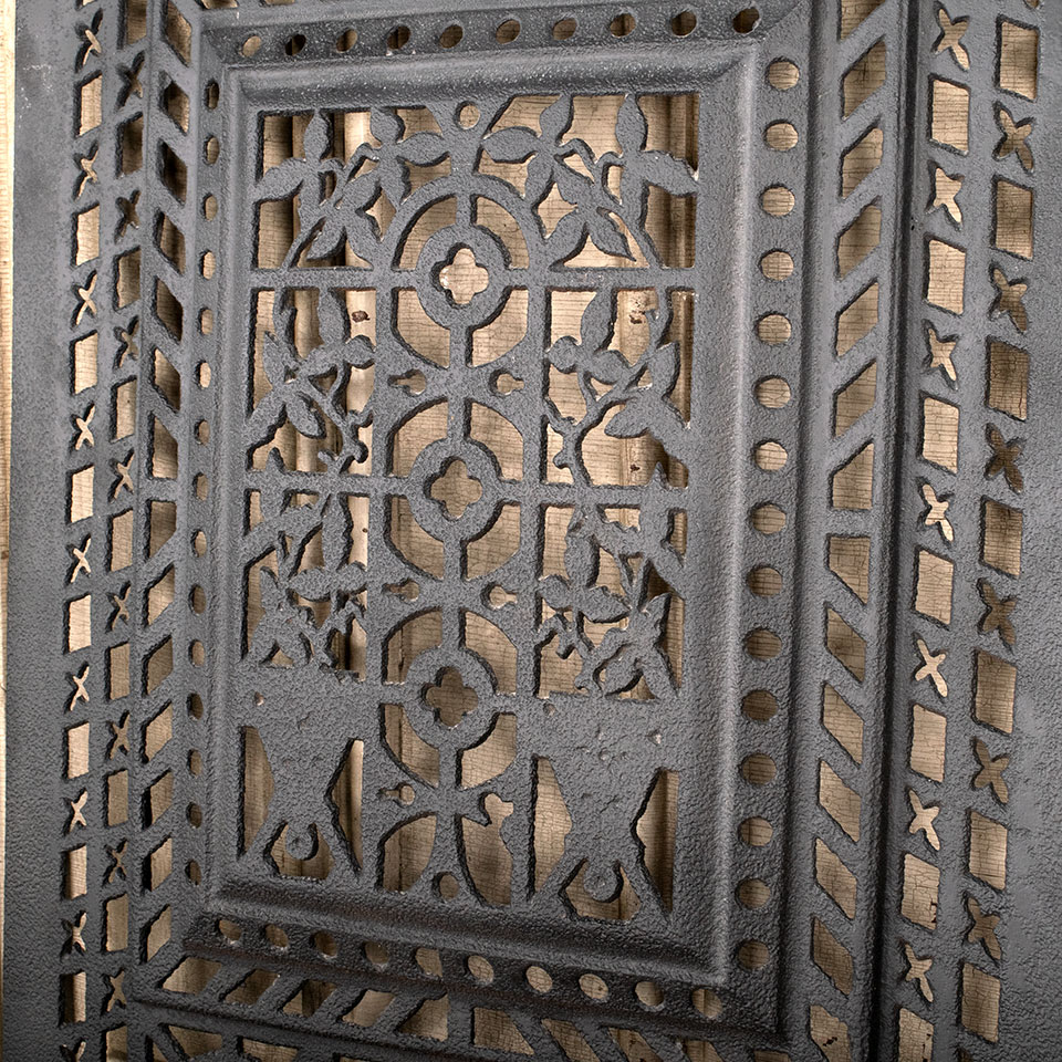 Antique architectural salvage cast iron fireplace summer front cover with floral motif measuring approx. 20" wide x 28 7/16" tall x 1 3/4" front to back. See photos to evaluate condition.