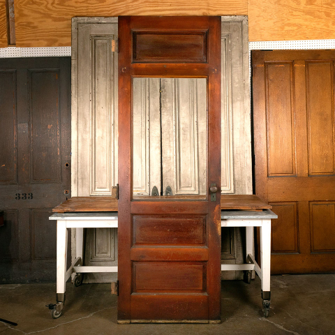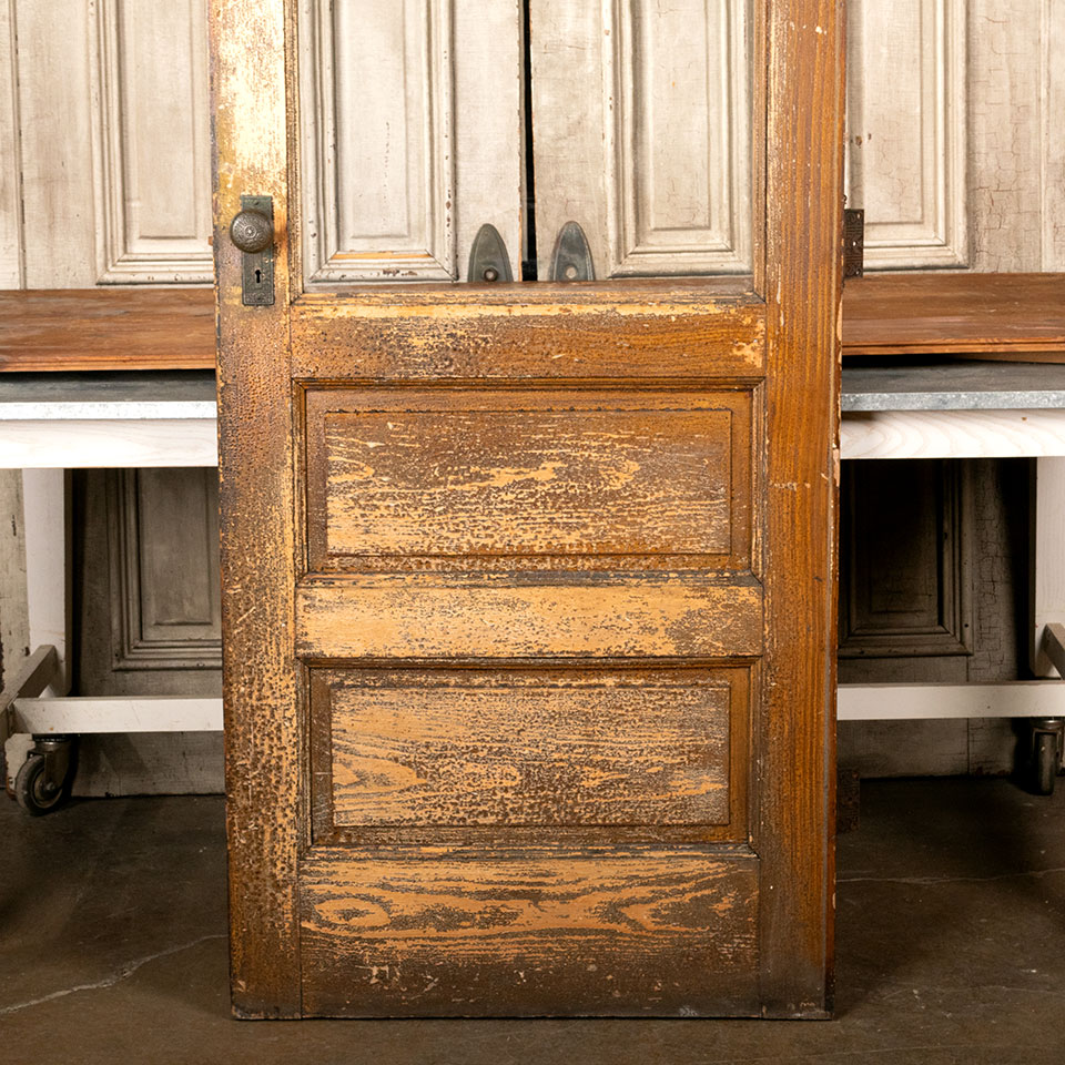 Antique architectural salvage half lite 3 horizontal panel pine entry door with beautiful original wavy glass and hardware measuring approx. 32 3/16" wide x 95 3/4" tall x 1 3/4" thick. See photos to evaluate condition. Priced at $2,000 for the door and $250 for the hardware.