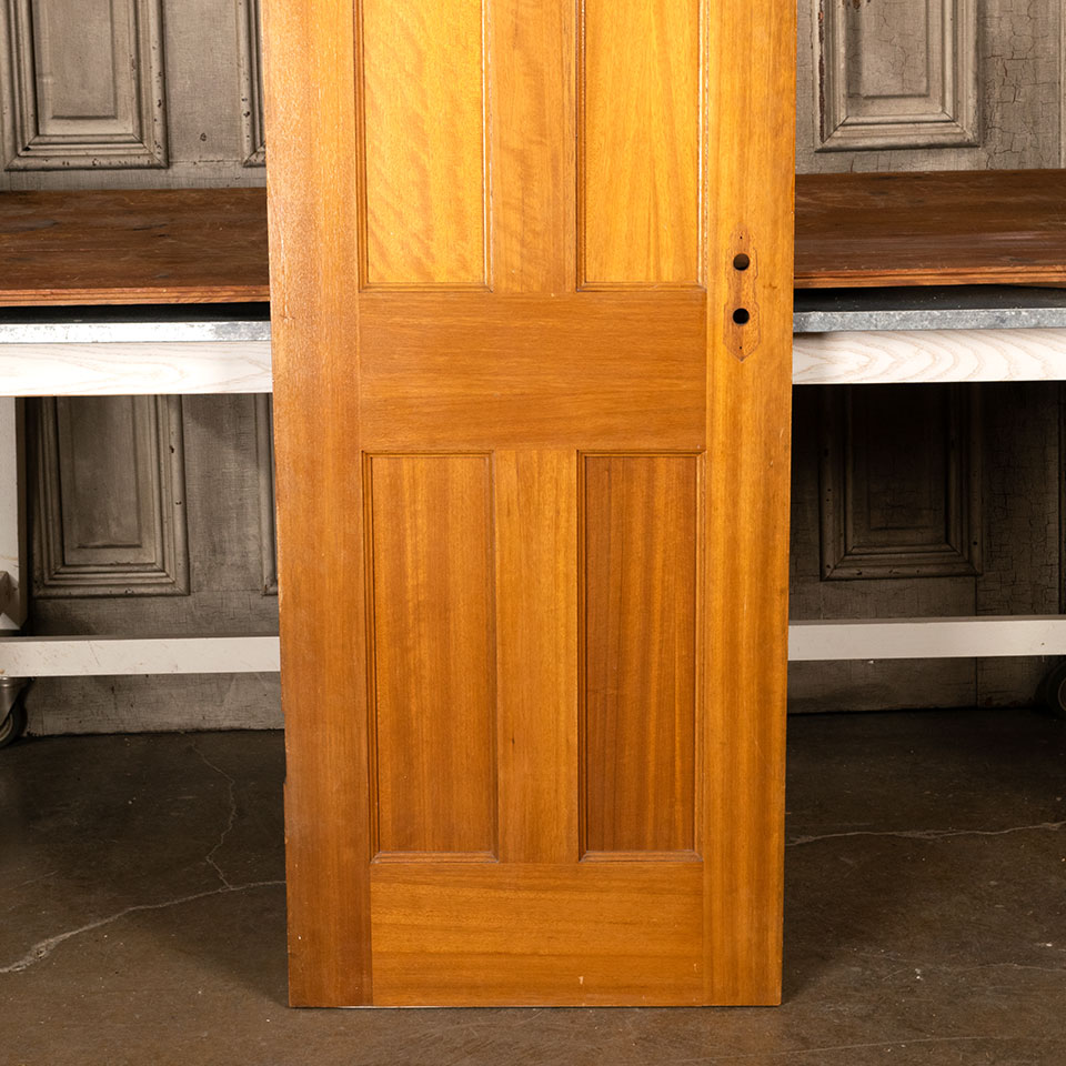 Vintage architectural salvage 6 panel mahogany wood interior door with modern barn door trollies measuring approx. 23 5/8" wide x 75 5/8" tall (81 1/2" to top of trollies) x 1 3/8" thick. There is no track with this door. See photos to evaluate condition.