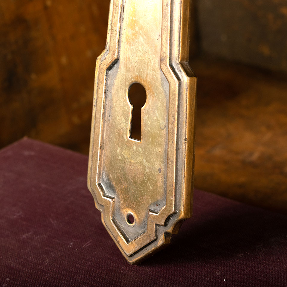 Antique architectural salvage steel Art Deco style doorknob backplate hardware measuring approx. 1 3/4" wide x 6 1/4" tall with a 7/8" diameter collar. The spindle and keyhole measure 2 1/2" on center. Color and condition vary, see photos to evaluate. Sold individually at $15/each.