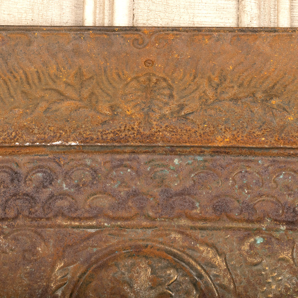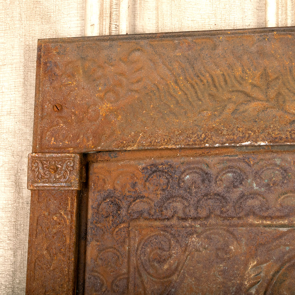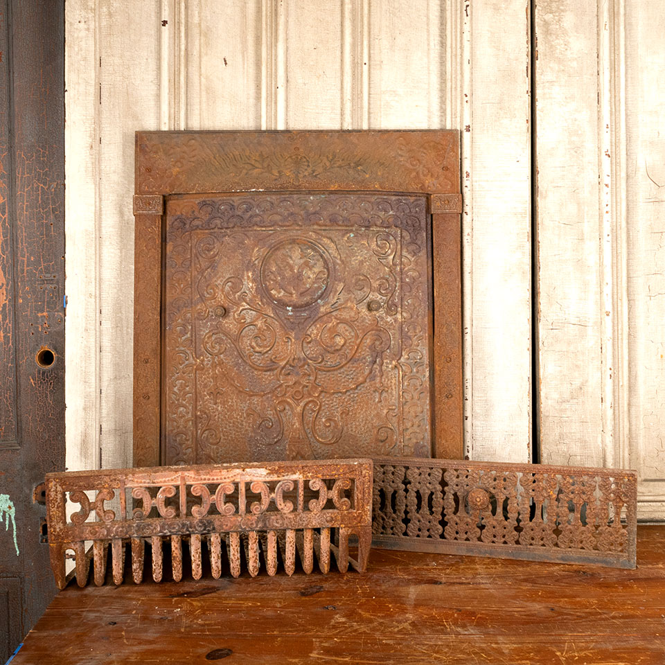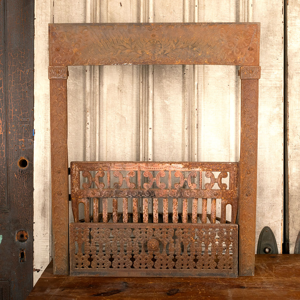 Antique architectural salvage 4 piece ornate fireplace surround, summer front cover, coal basket, and ember screen. The surround measures approx. 24 5/8" wide x 30 1/2" tall x 2 1/2" front to back with an interior opening measuring approx. 20 1/2" wide x 25 1/2" tall. The surround and summer front cover are pressed metal, but the other pieces are cast iron. There's surface rust on these pieces. See photos to evaluate condition. Sold as a set. Priced at $525 for the set.
