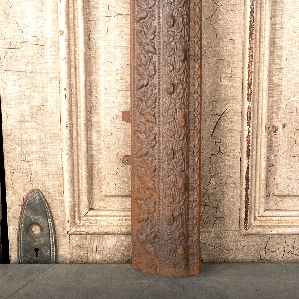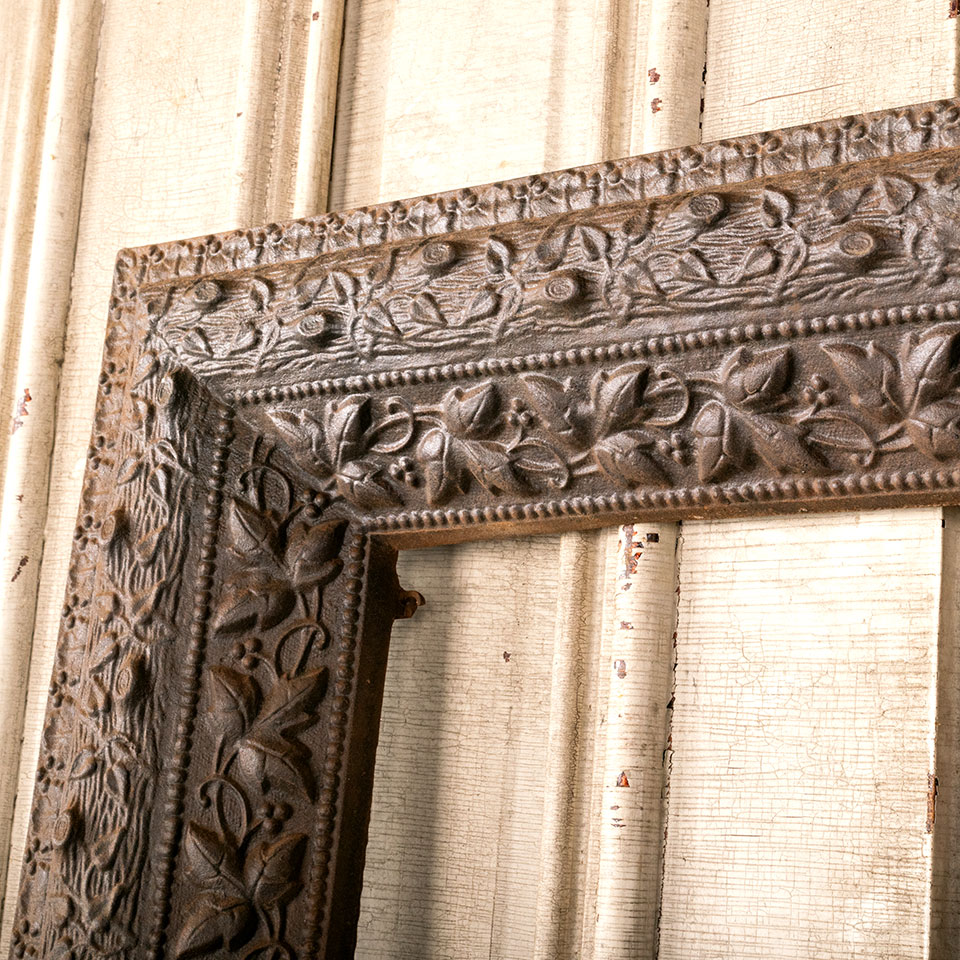 Antique architectural salvage cast iron fireplace surround with floral motif measuring approx. 30 1/8" wide x 32 1/2" tall x 3 1/4" front to back. The interior firebox opening measures approx. 19 15/16" wide x 27 7/16" tall. See photos to evaluate condition.
