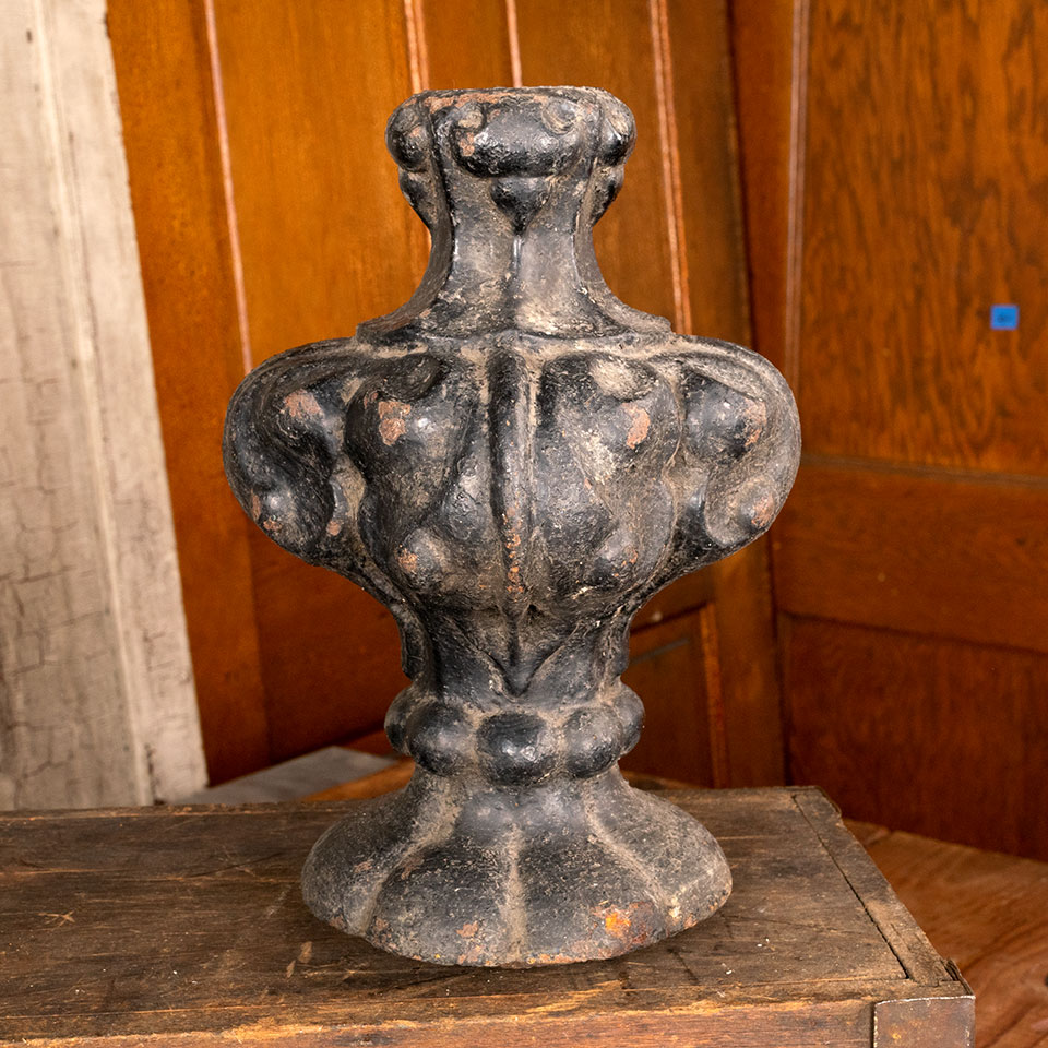 Antique architectural salvage cast iron post finial measuring approx. 7 1/2" in diameter x 9 3/4" tall with a 5" diameter base. See photos to evaluate condition.