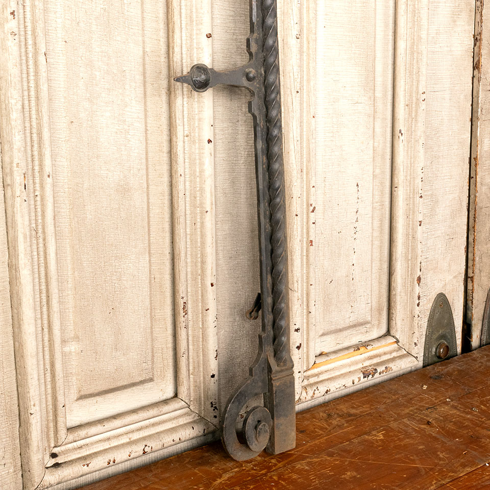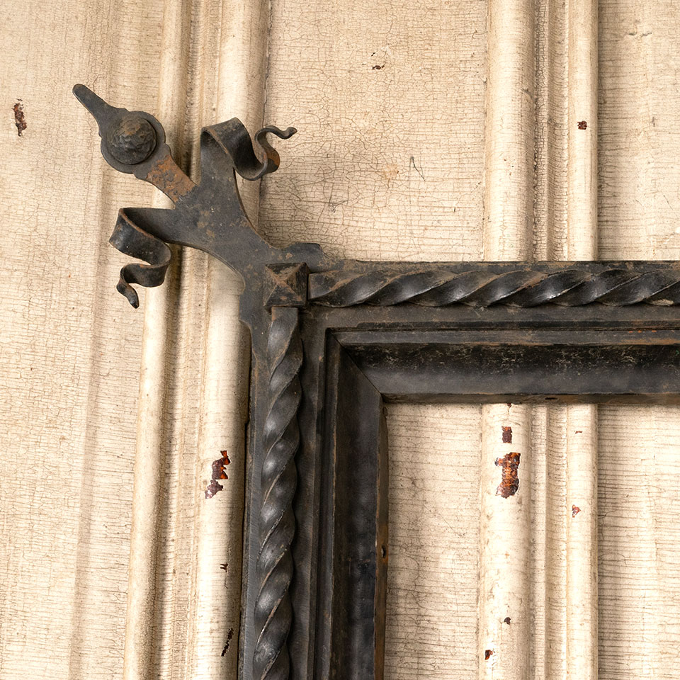 Antique architectural salvage wrought iron fireplace surround measuring approx. 45 1/2" wide (widest point) x 36 1/2" tall (tallest point) x 2 1/2" front to back. The interior firebox opening measures approx. 32 1/4" wide x 30 1/4" tall. See photos to evaluate condition.