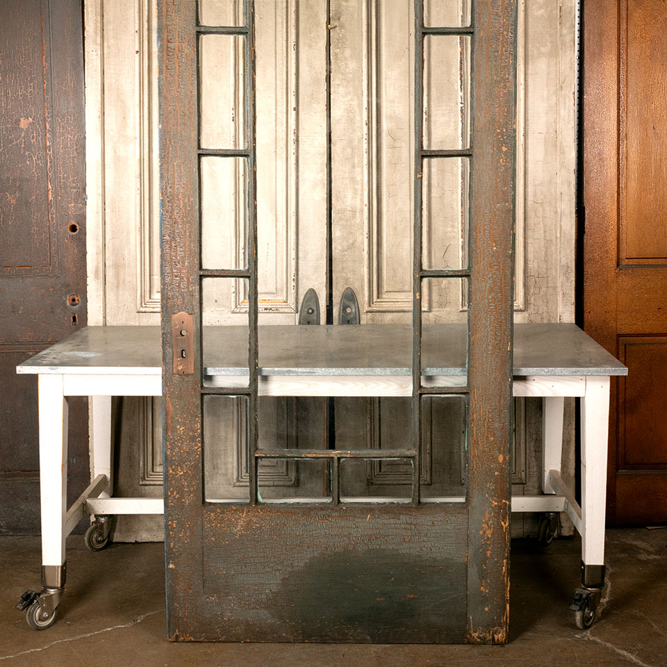 Antique architectural salvage large wood door with arched divided lite window measuring approx. 41" wide x 103 3/8" tall x 1 5/8" thick. At some point in the door's history a 3/8" piece of wood was added to the hinged side of the door and a piece of trim along the top on one side of the door. See photos to evaluate condition.