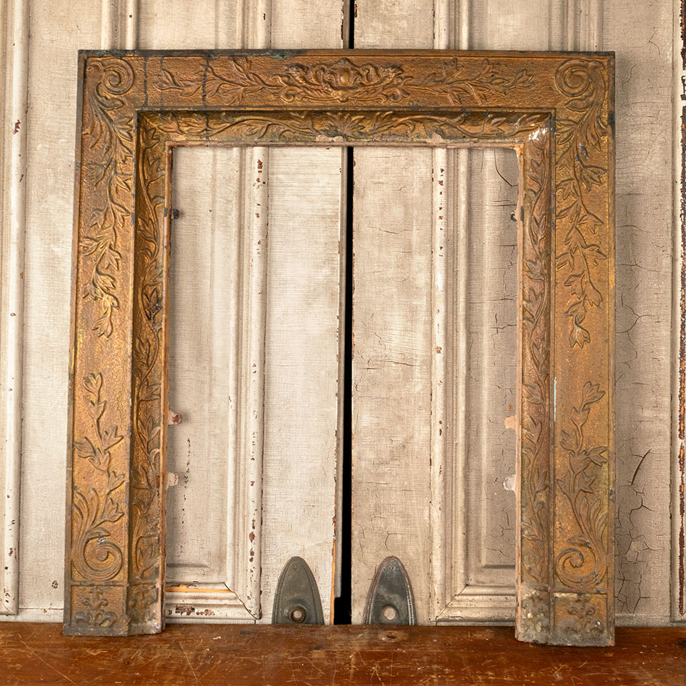 Antique architectural salvage ornate cast iron fireplace surround with vine motif measuring approx. 30 5/8" wide x 33 1/8" tall x 2 1/4" front to back. The interior firebox opening measures approx. 20" wide x 27 5/8" tall. See photos to evaluate condition.