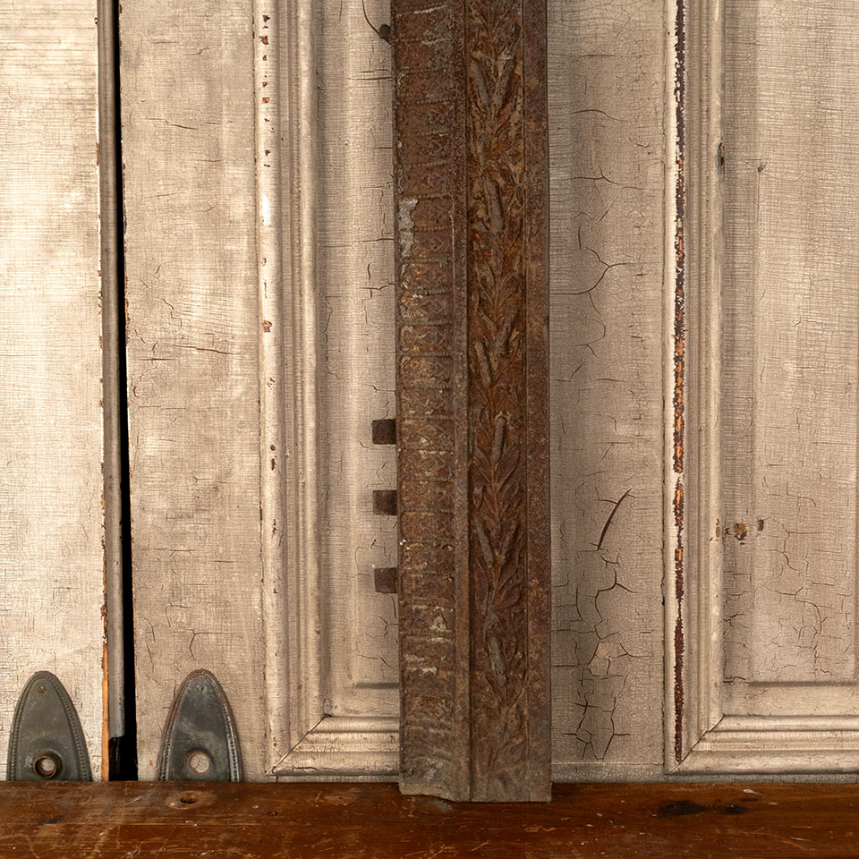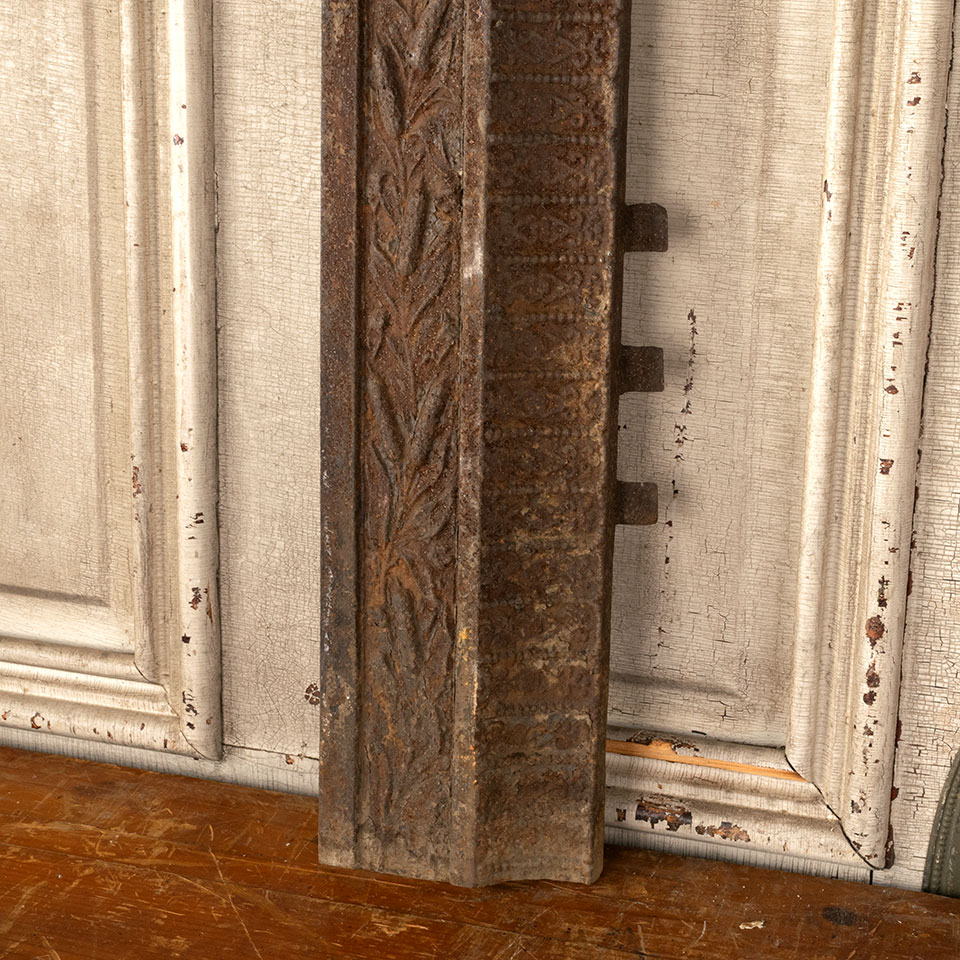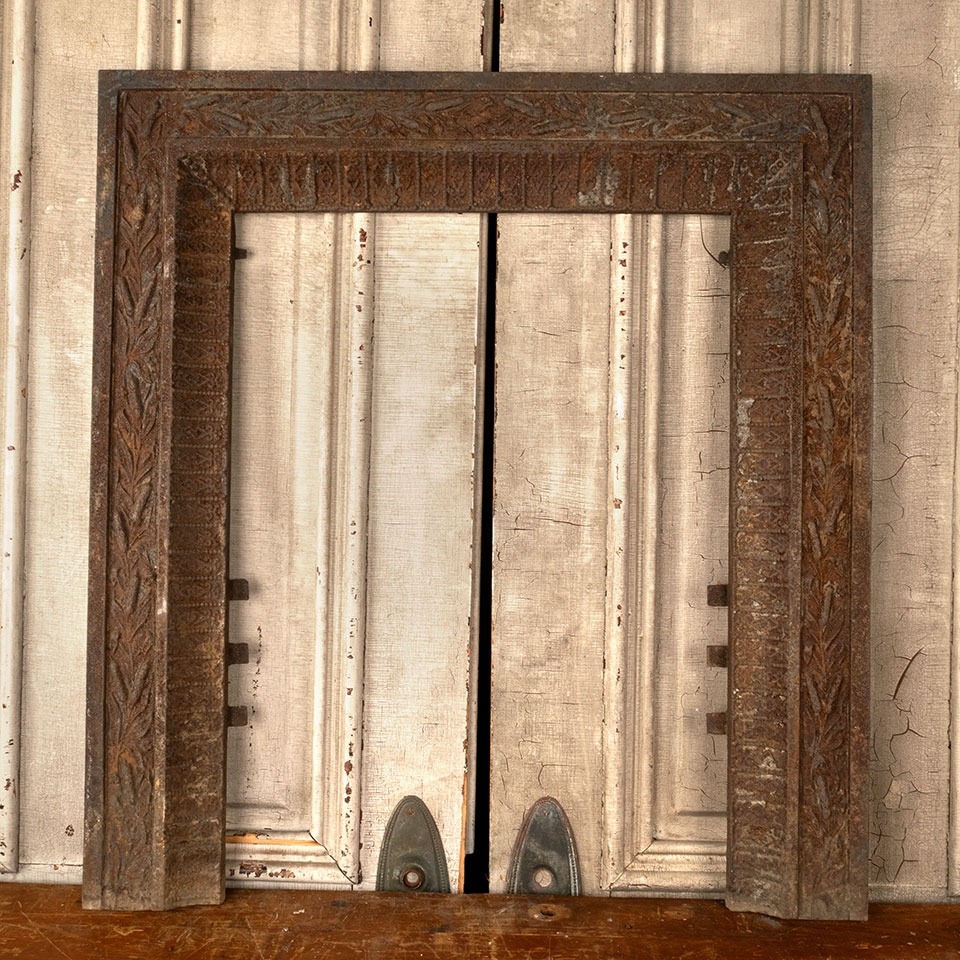 Antique architectural salvage ornate cast iron fireplace surround with cattail motif measuring approx. 30 1/2" wide x 33" tall x 1 7/8" front to back. The interior firebox opening measures approx. 20" wide x 27 3/4" tall. See photos to evaluate condition.