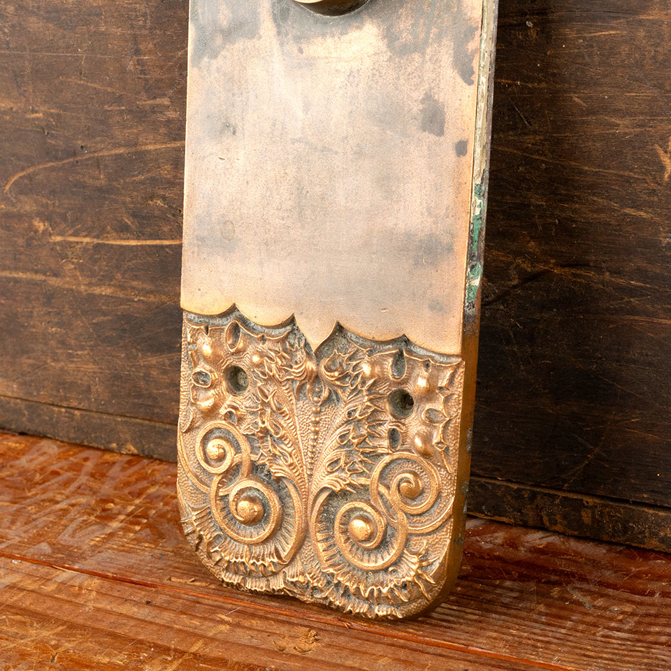 Antique architectural salvage cast bronze Chicago Niles Thistle pattern c. 1889 entry door backplate stamped CHICAGO with a deadbolt hole measuring approx. 3 3/8" wide x 16 1/2" tall x 1/4" thick with a 7/8" diameter collar. The deadbolt and top keyhole measure 3 1/2" on center. See photos to evaluate condition.