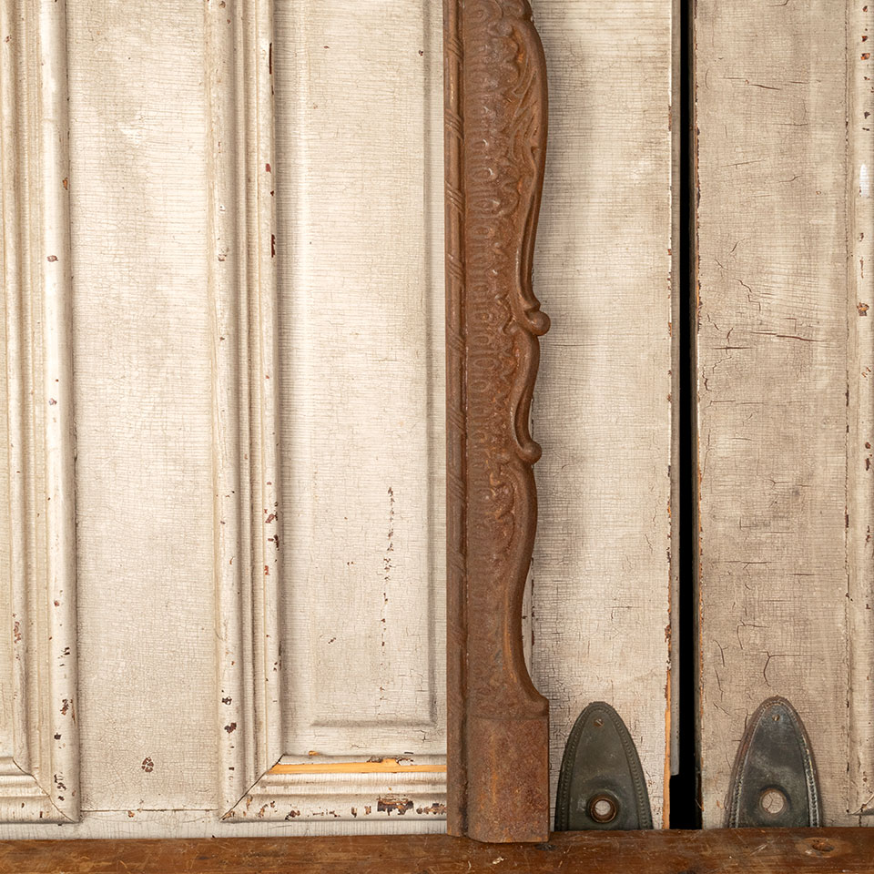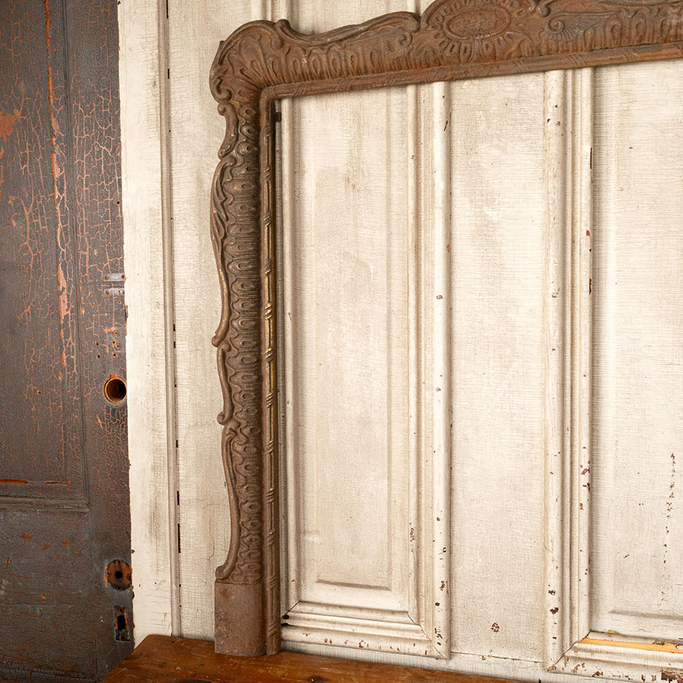 Antique architectural salvage ornate cast iron fireplace surround measuring approx. 26 1/4" wide x 32" tall x 1 3/4" front to back. The interior opening measures approx. 20" wide x 27 5/8" tall. See photos to evaluate condition.