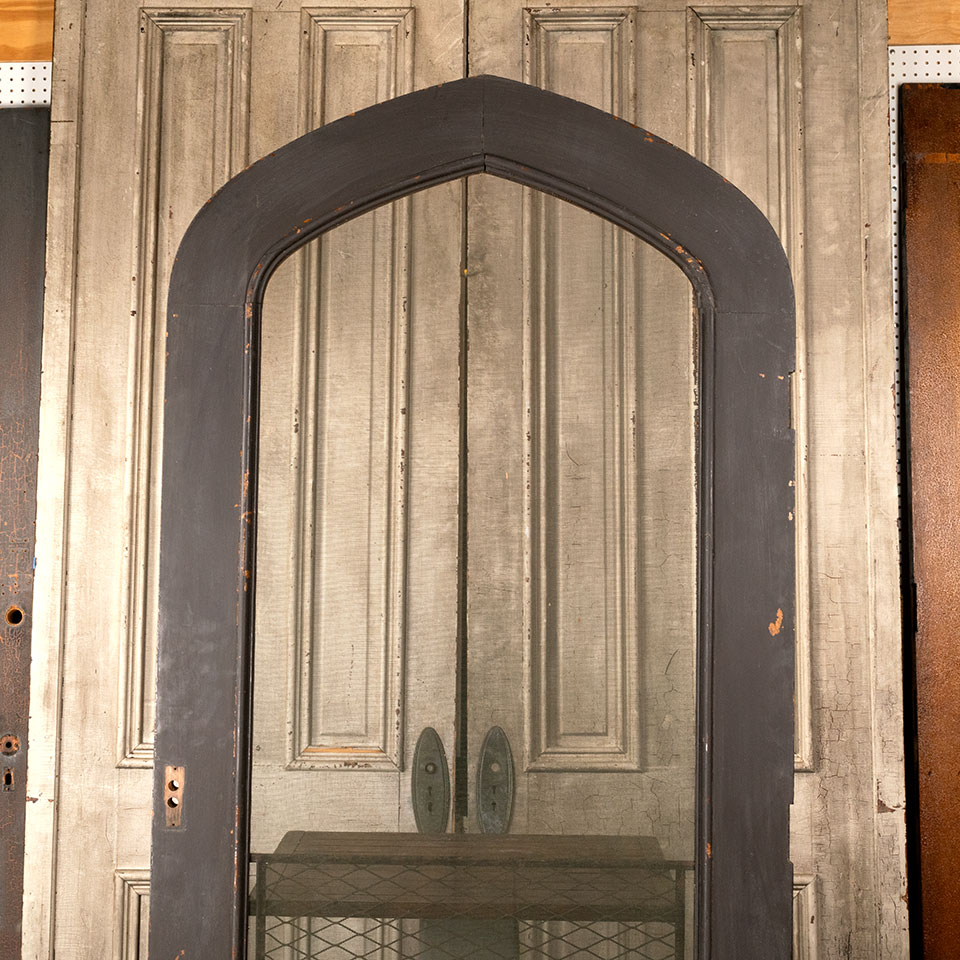 Vintage antique architectural salvage painted oak pointed arch screen door measuring approx. 38 7/8" wide x 84 1/2" tall x 1 1/2" thick. See photos to evaluate condition.