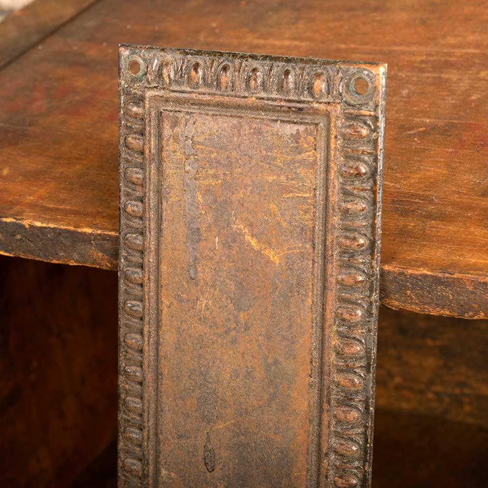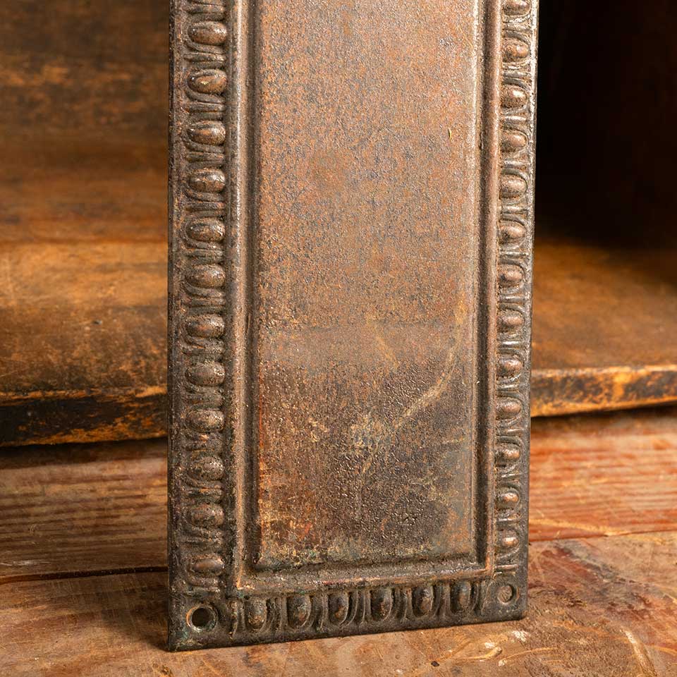 Architectural salvage antique steel door push plate door hardware with egg & dart pattern border measuring approx. 3" wide x 10 1/2" tall x 1/8" front to back. See photos to evaluate condition.