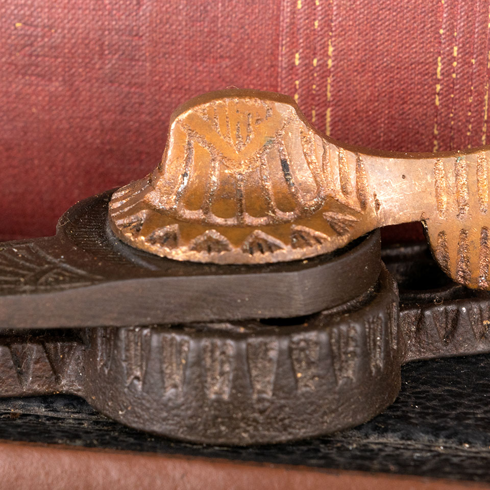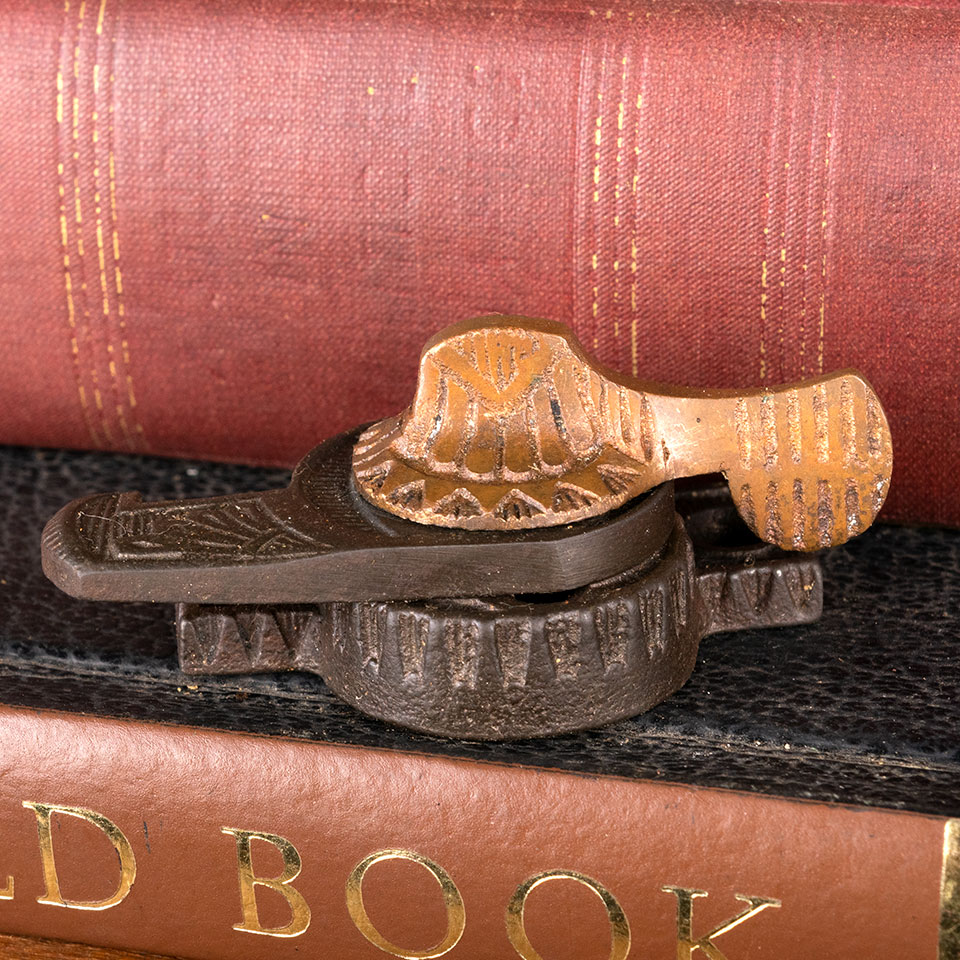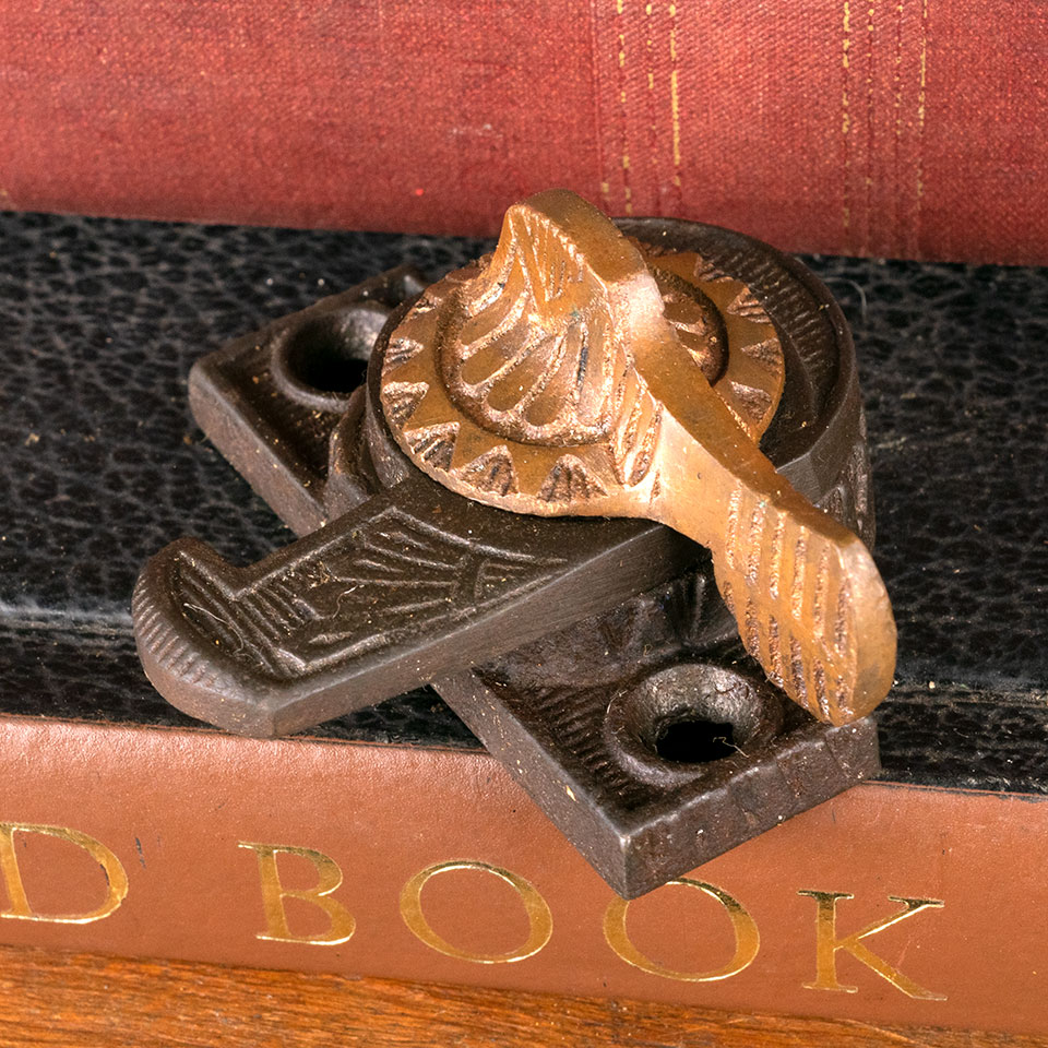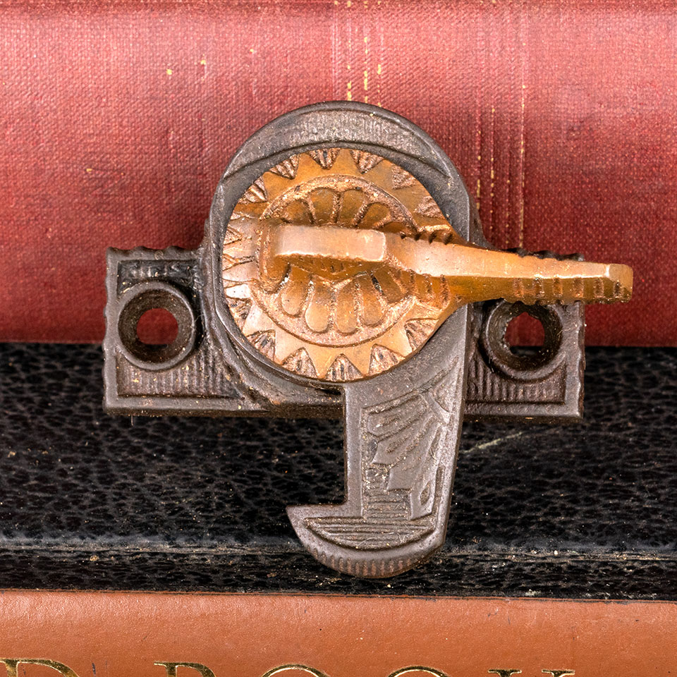 Architectural salvage antique Victorian operable bronze and cast iron double hung window sash lock hardware with sundial motif measuring approx. 2" wide x 1" tall x 2" front to back. Lock only, keeper not included. Color and condition may vary, see photos to evaluate. Priced at $20/each.