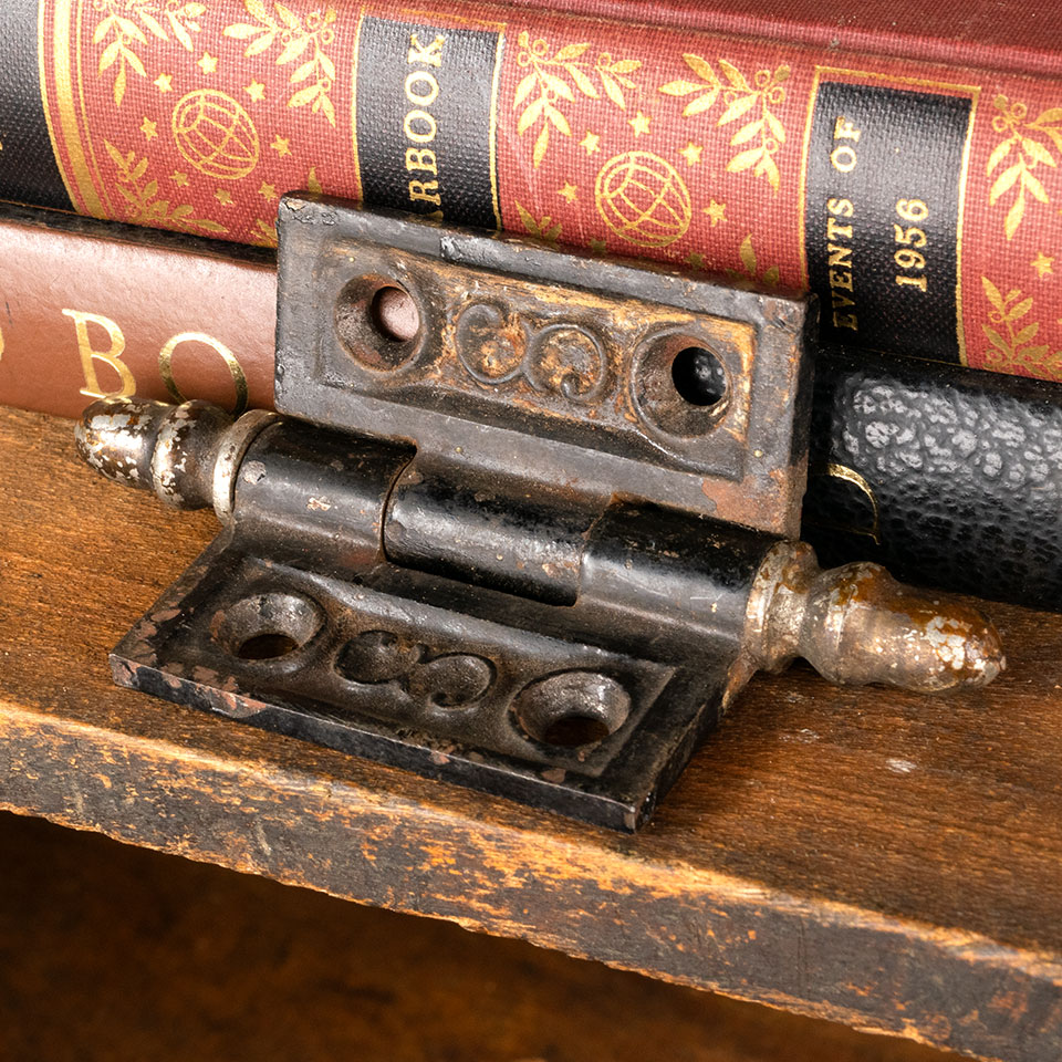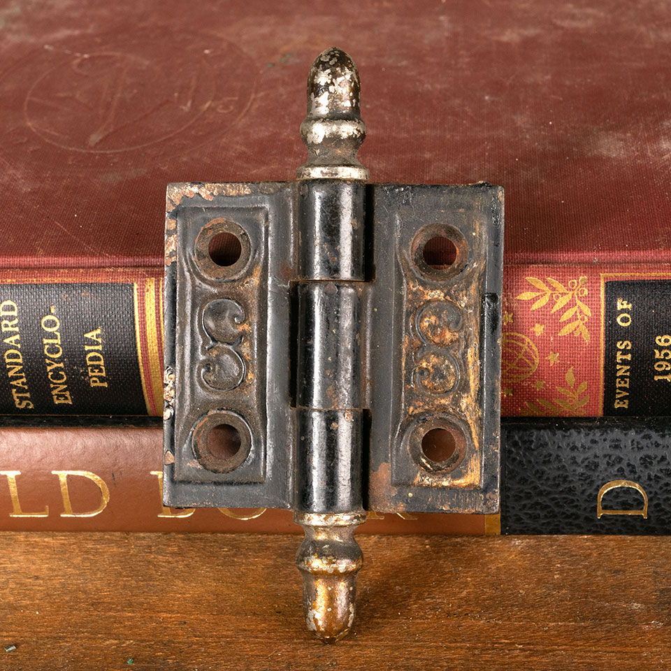 Antique architectural salvage ornate cast iron acorn finial hinge measuring approx. 2" square (3 3/4" tall including finials). See photos to evaluate condition. Priced at $20.