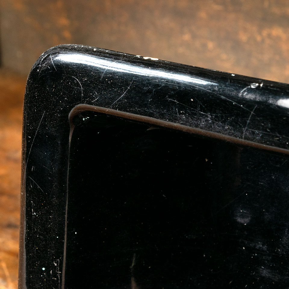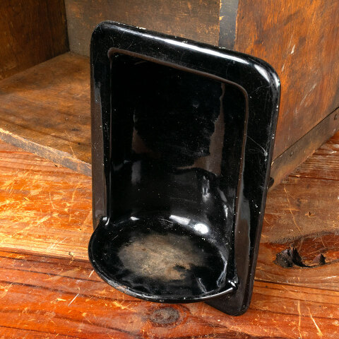 Vintage architectural salvage cast iron black porcelain enameled in-the-wall bathroom cup holder shelf niche measuring approx. 5 1/4" wide x 6 1/2" tall x 3 3/4" front to back. Color and condition may vary, see photos to evaluate. Priced at $45/each.
