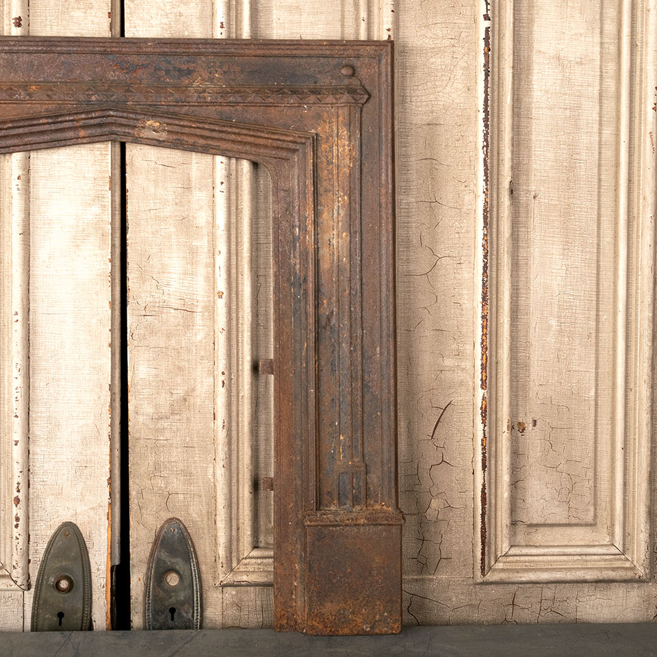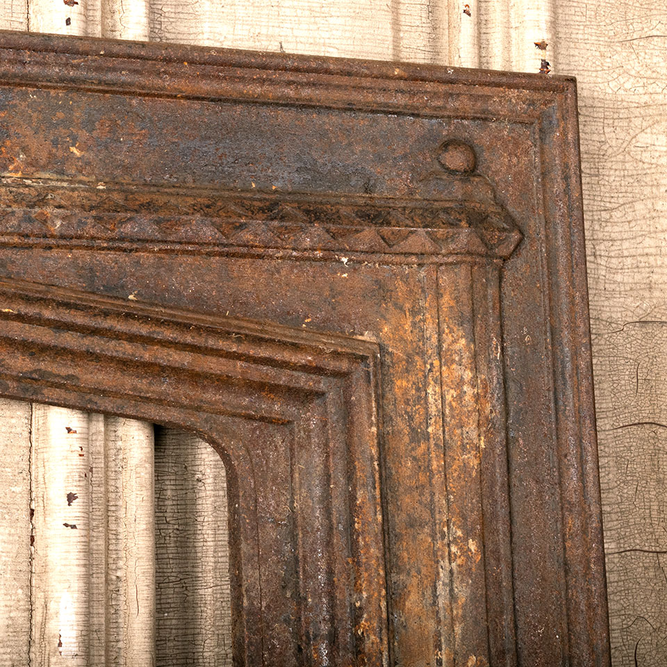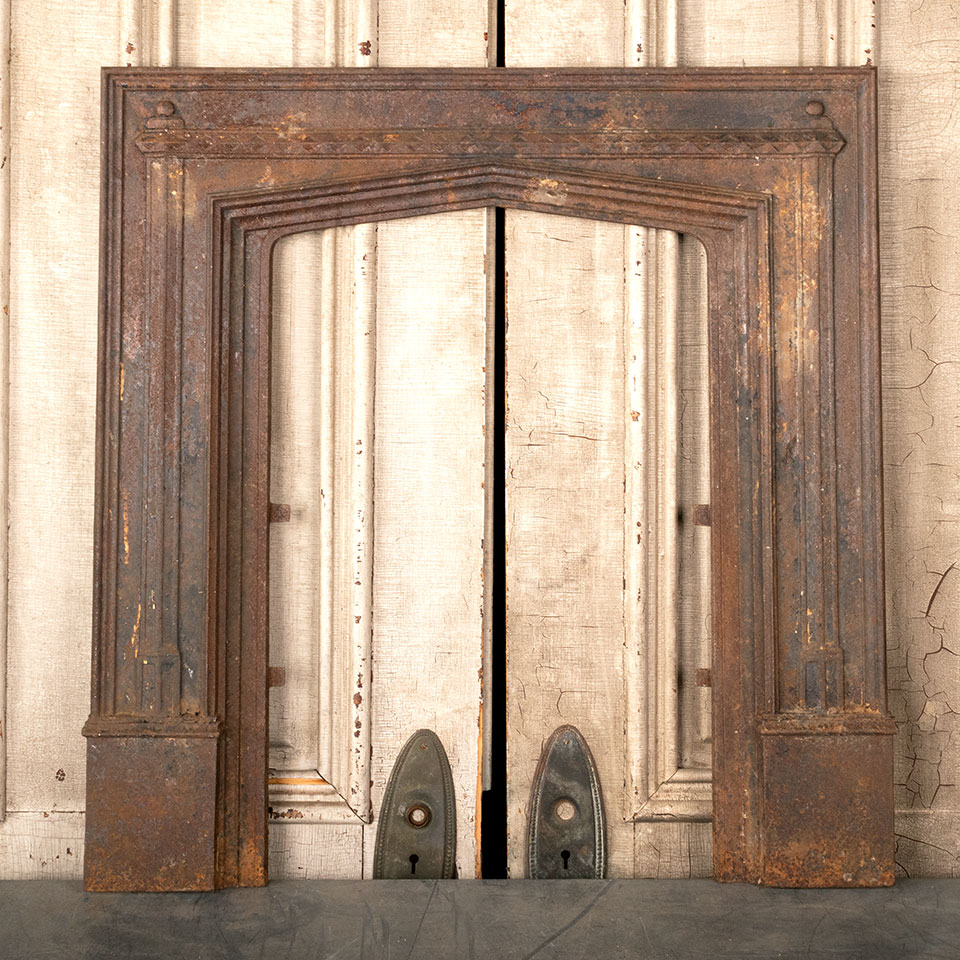Antique architectural salvage cast iron fireplace surround with pointed arch opening measuring approx. 29 11/16" wide x 31 1/8" tall x 2" front to back. The interior firebox opening measures approx. 16 3/4" wide x 26" tall. See photos to evaluate condition.