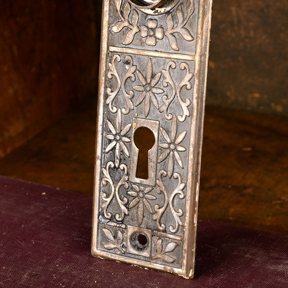Antique architectural salvage wrought steel Lockwood Cairo/Halfa pattern (circa 1897) doorknob backplate hardware with skeleton keyhole measuring approx. 1 3/4" wide x 5 3/4" tall. The 3/4" diameter collar and keyhole measure 2 1/2" on center. Color and condition may vary, see photos to evaluate. Priced at $18/each.