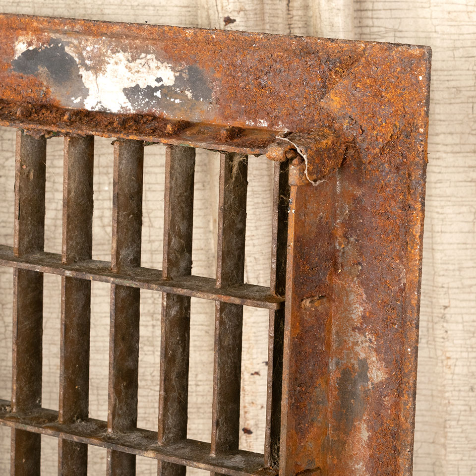 Vintage antique architectural salvage metal heat grate floor register vent cover measuring approx. 8" x 14" (insert dimensions) and 10" x 16" (overall dimensions). See photos to evaluate condition.