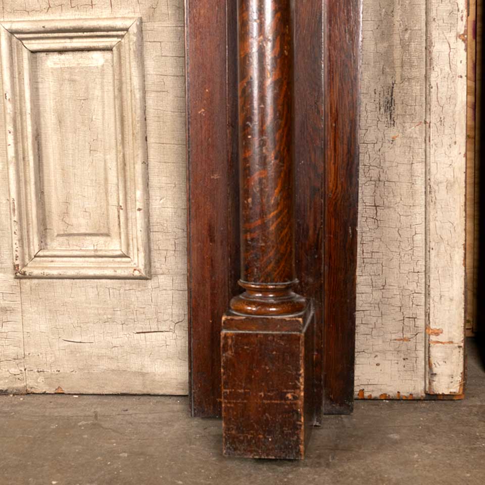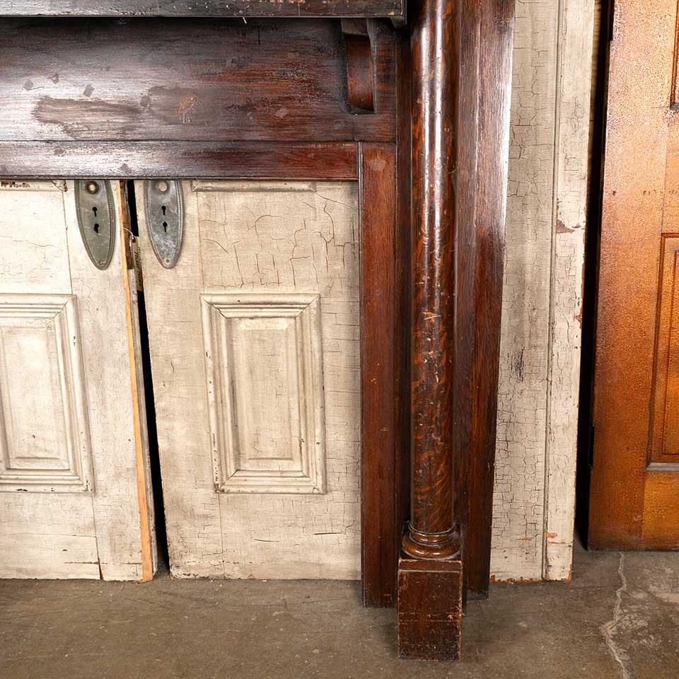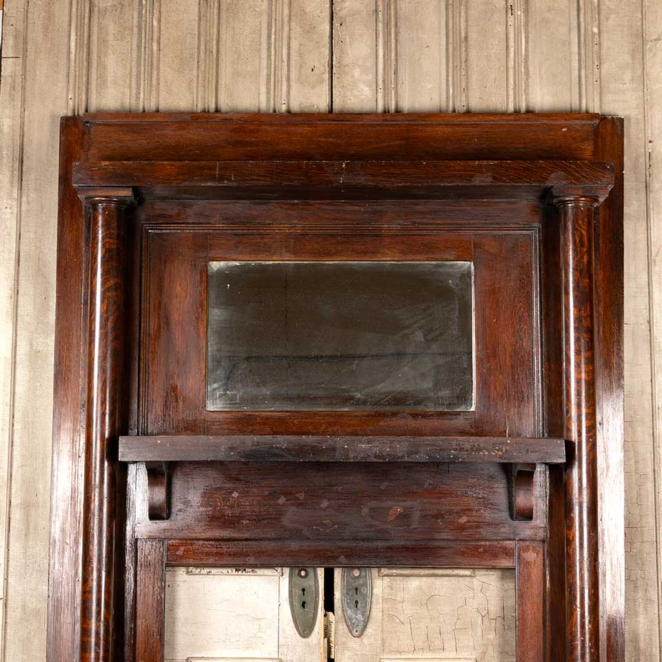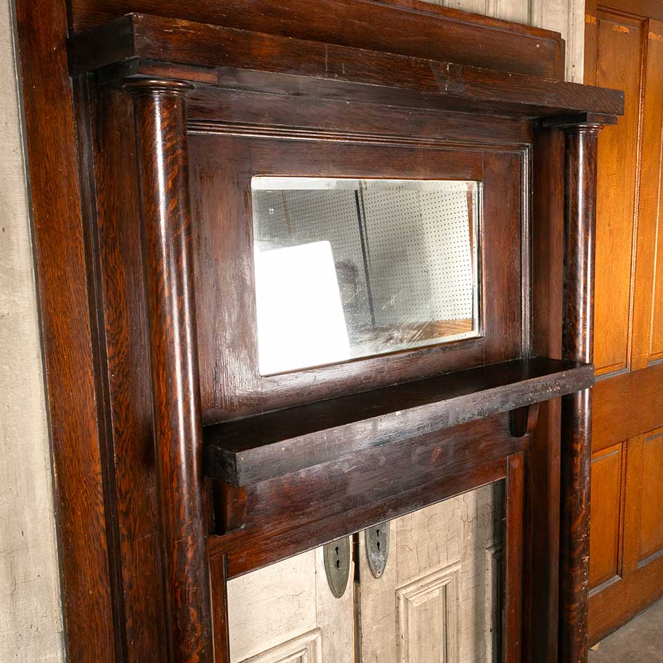 Antique architectural salvage oak fireplace mantel / mantle with beveled glass mirror measuring approx. 59 1/2" wide x 82 1/4" tall x 10 1/2" front to back. The interior firebox opening measures approx. 35 1/2" wide x 35 3/4" tall. See photos to evaluate condition.