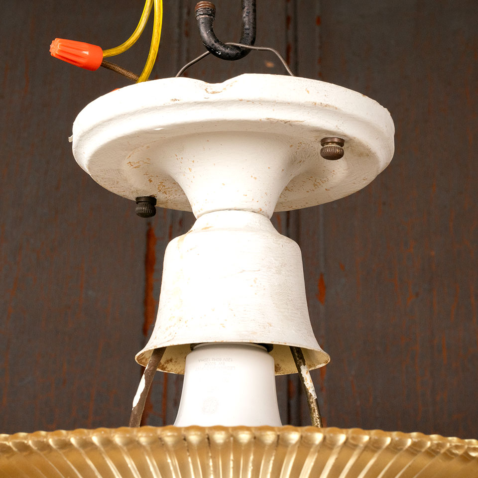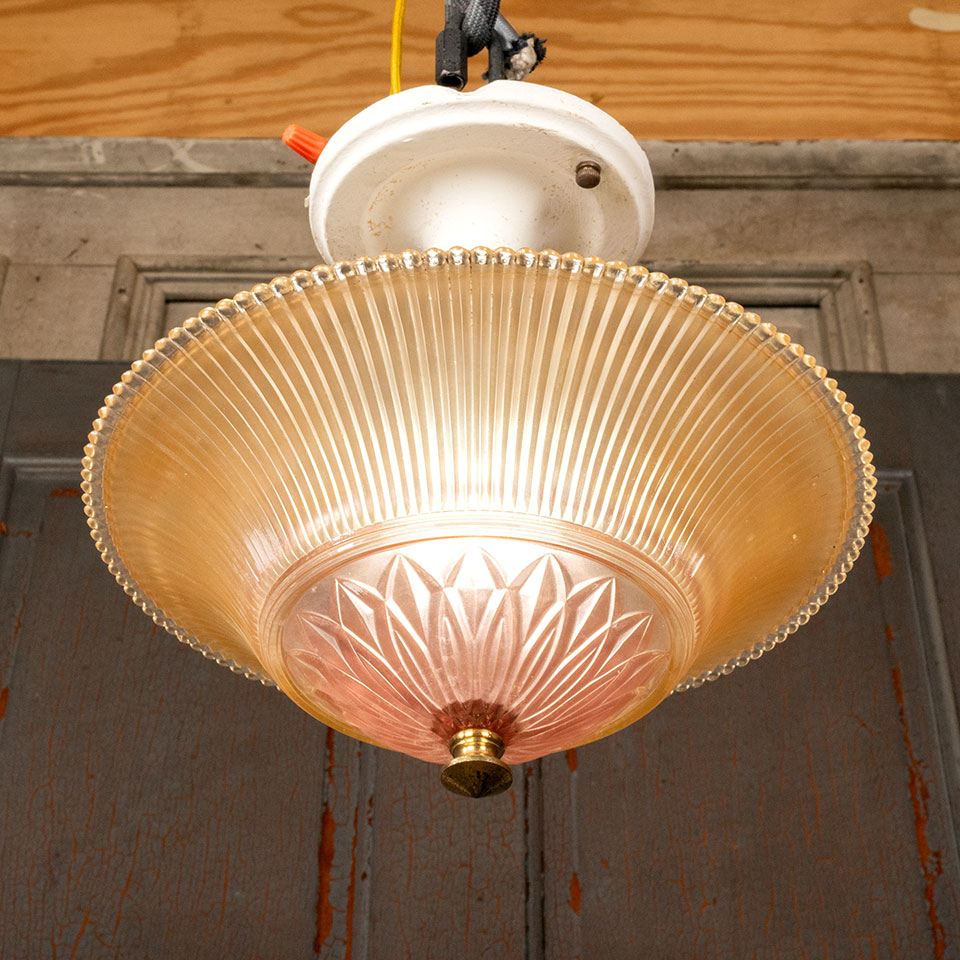 Vintage flush mount single light chandelier with colored glass shade measuring approx. 10 1/2" in diameter x 10" tall. See photos to evaluate condition.