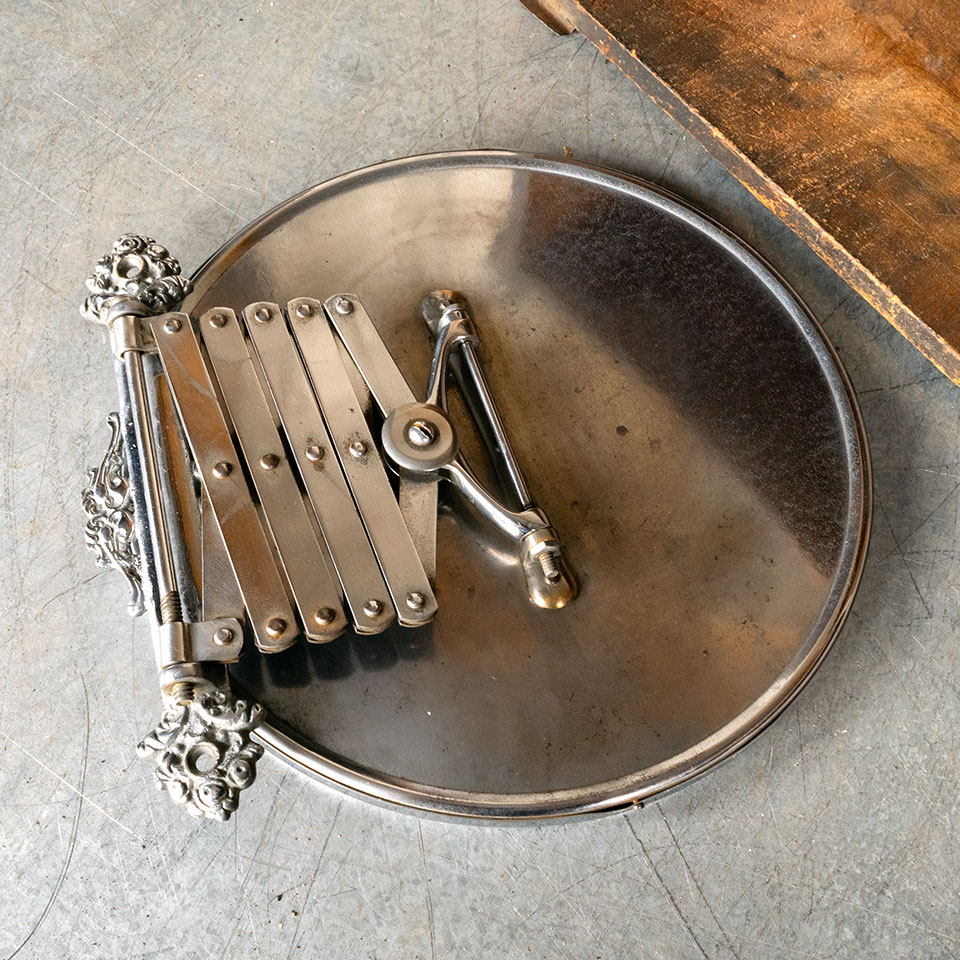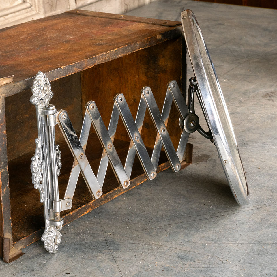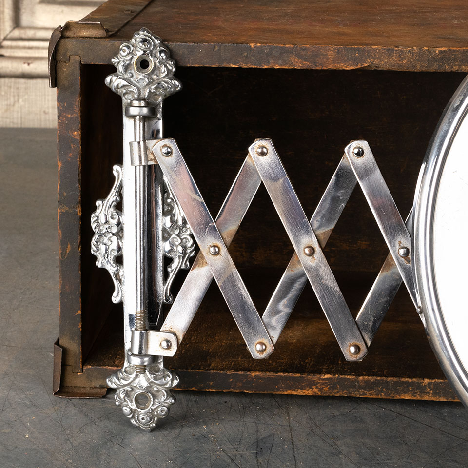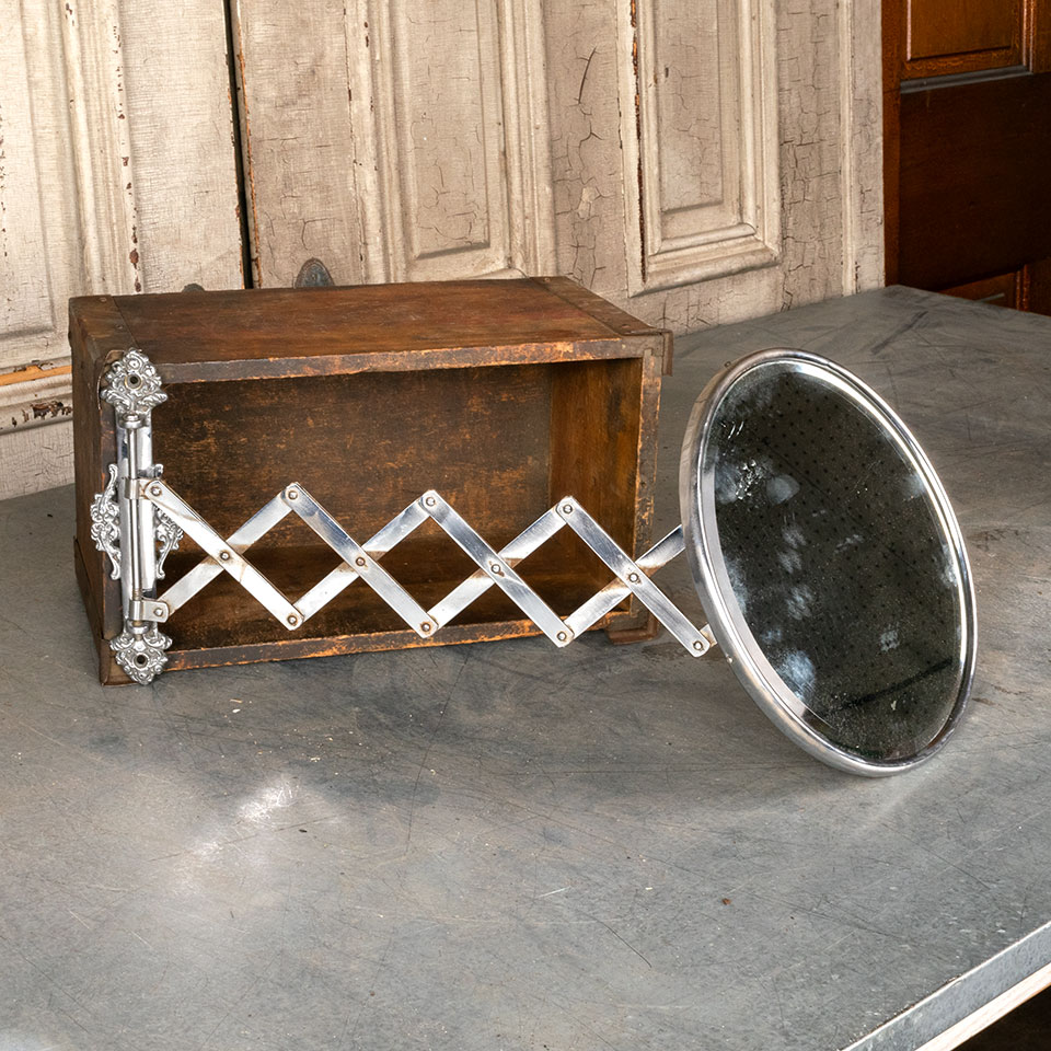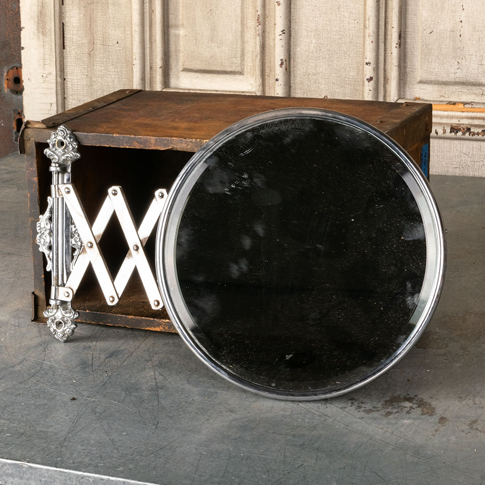 Antique architectural salvage large round beveled glass retractable shaving mirror measuring approx. 10 1/4" in diameter. See photos to evaluate condition.