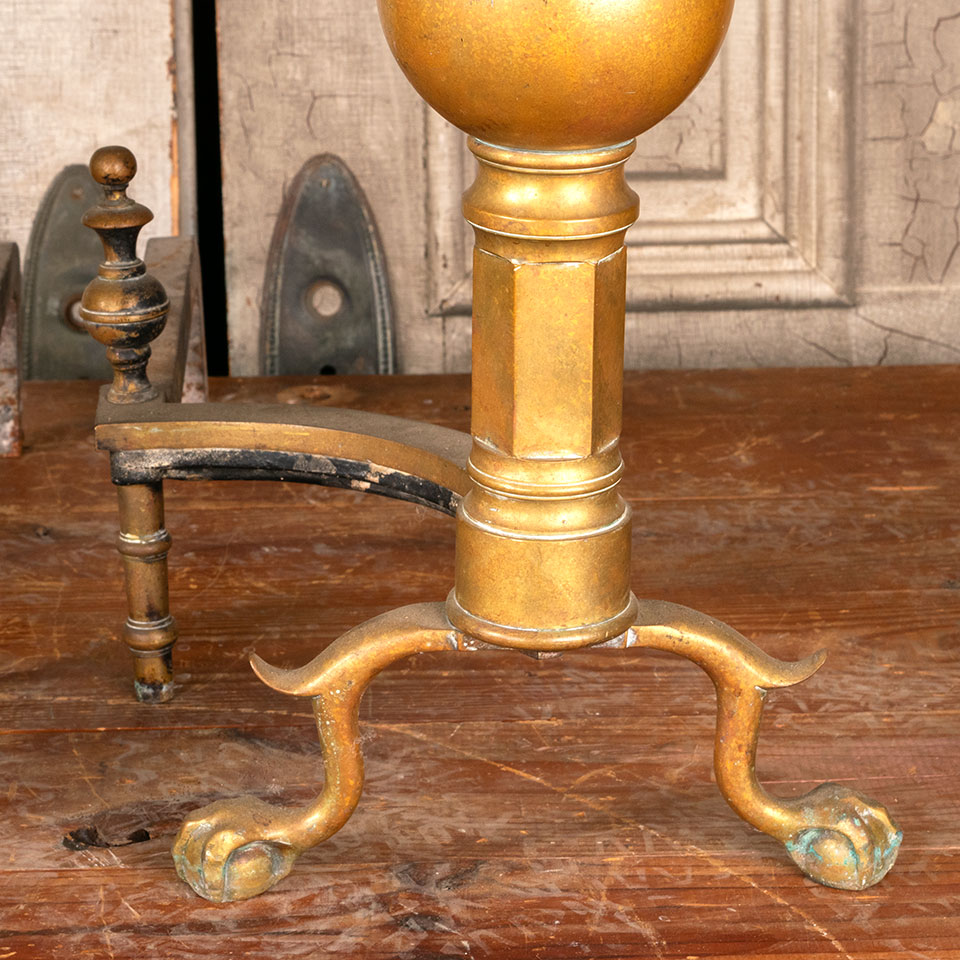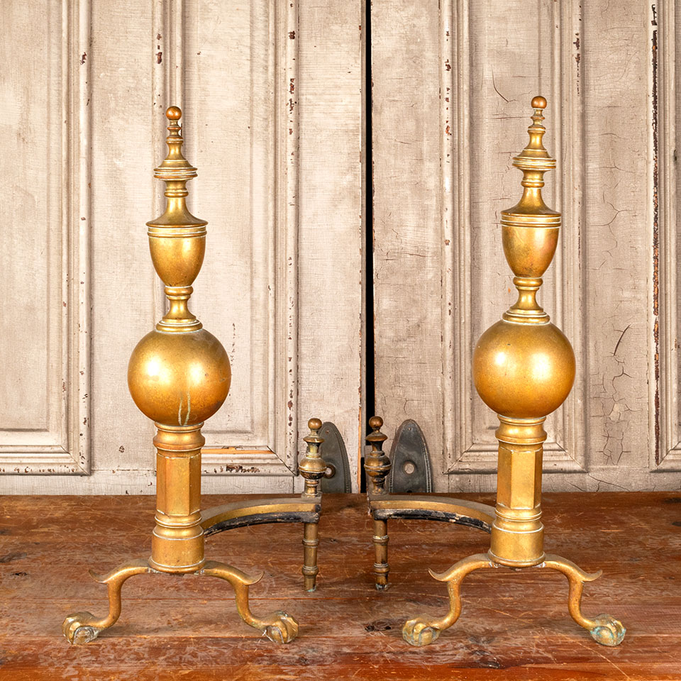 Pair of antique brass fireplace andirons each measuring approx. 11" wide x 25" tall x 23 1/2" front to back. See photos to evaluate condition. Priced at $175 for the pair.