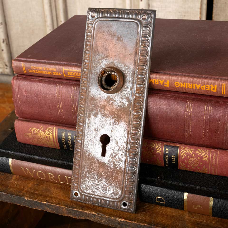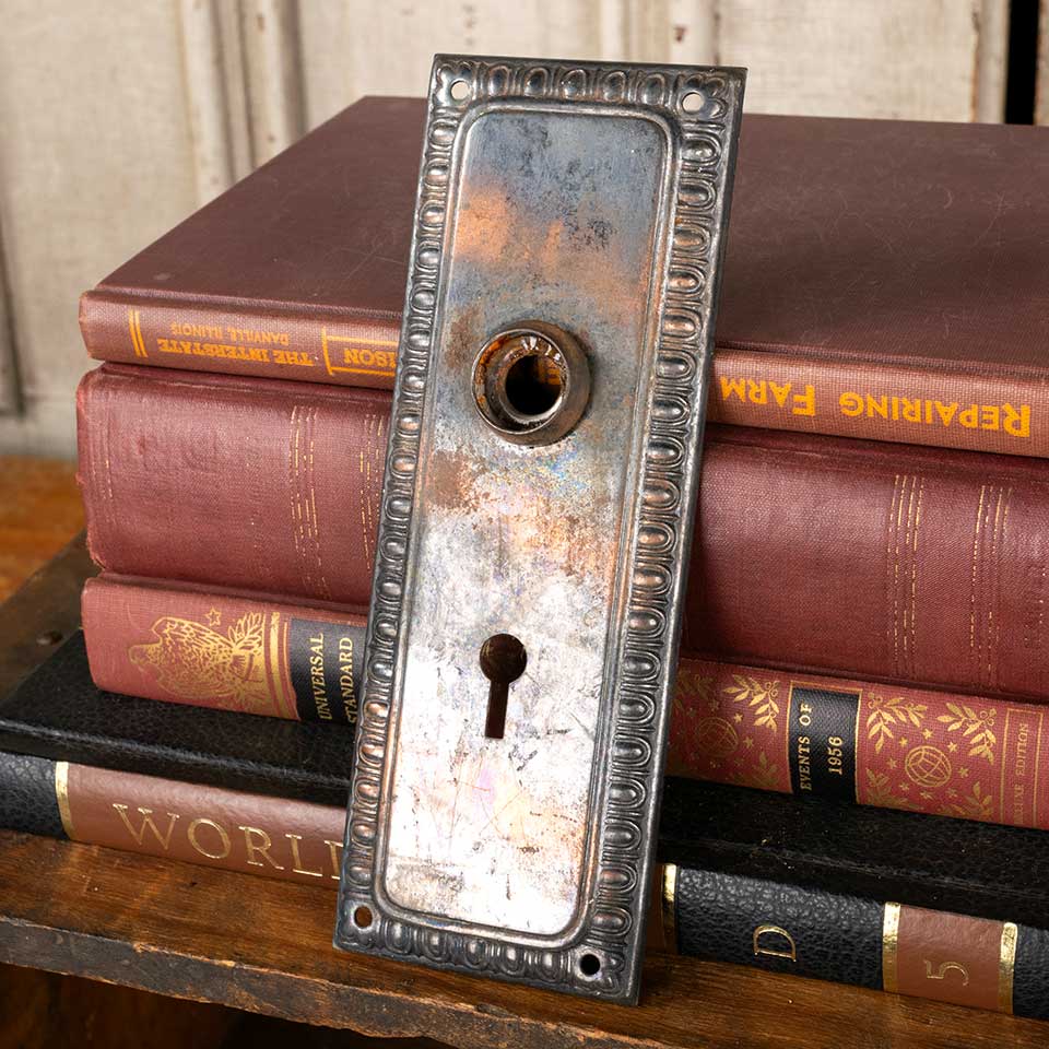 Antique architectural salvage metal doorknob backplate hardware with an egg & dart patterned border measuring approx. 2 1/2" wide x 7" tall with a 13/16" diameter collar. The spindle and keyholes measure 2 3/8" on centers. Color and condition vary, see photos to evaluate. Priced at $24/each.
