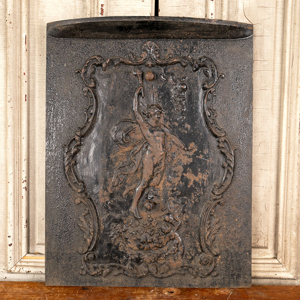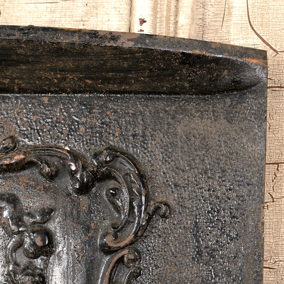 Antique architectural salvage ornate high relief cast iron fireplace summer front cover with figural motif measuring approx. 20 1/8" wide x 25 5/8" tall x 2 1/2" front to back. There's a crack at the bottom of this piece, but it doesn't affect the structural integrity of the piece. See photos to evaluate condition.