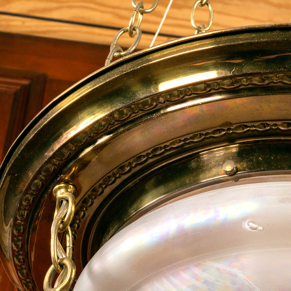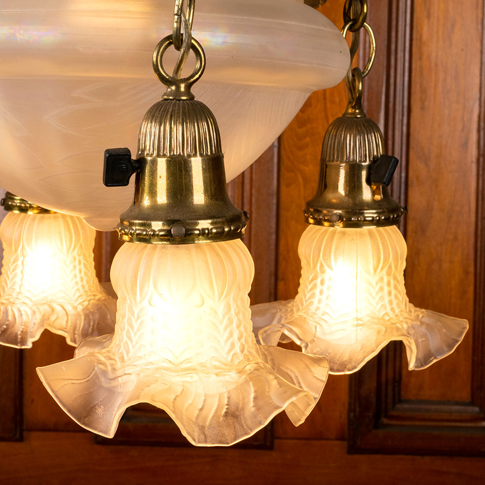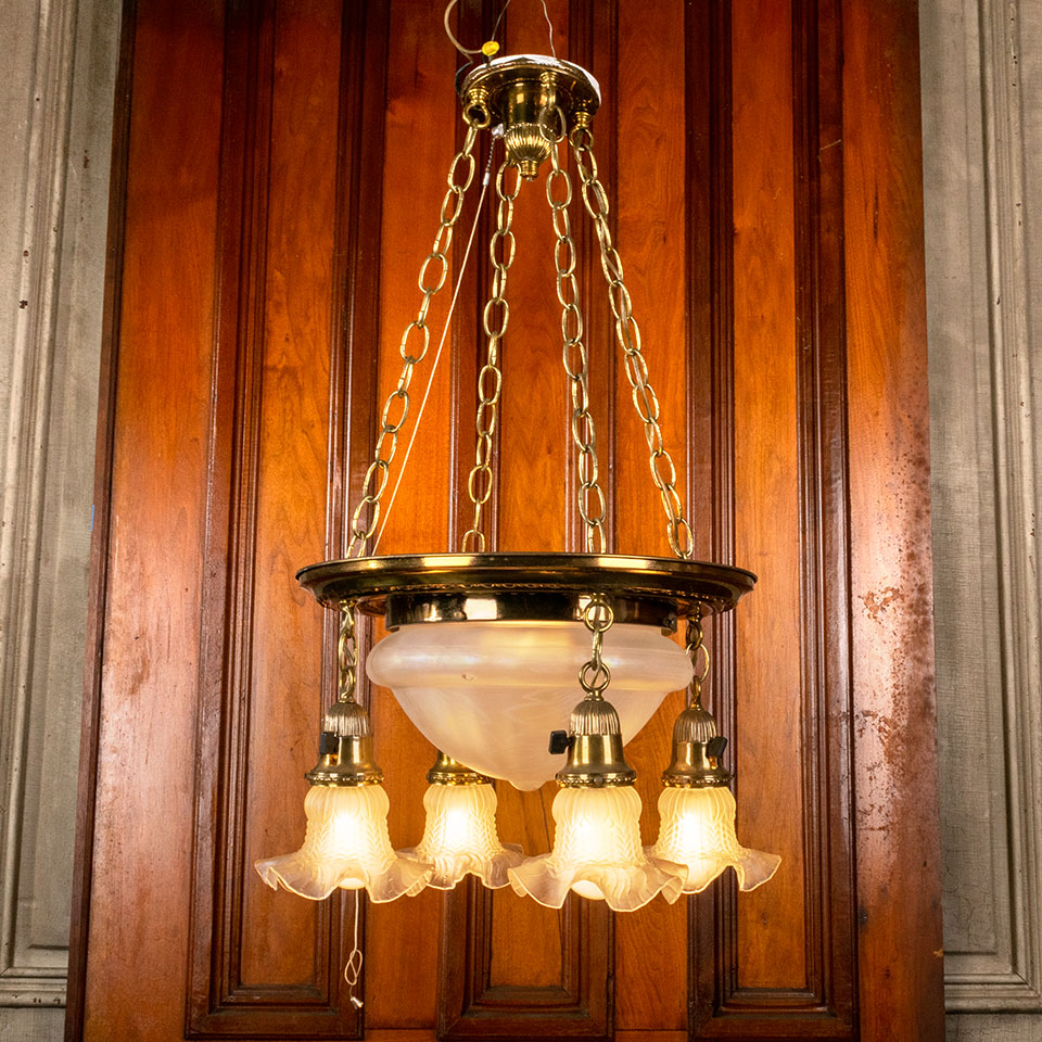 Architectural salvage antique five light chandelier with pull chain measuring approx. 21" in diameter x 29" tall. See photos to evaluate condition. Salvaged lighting should be inspected by a licensed electrician before installation.