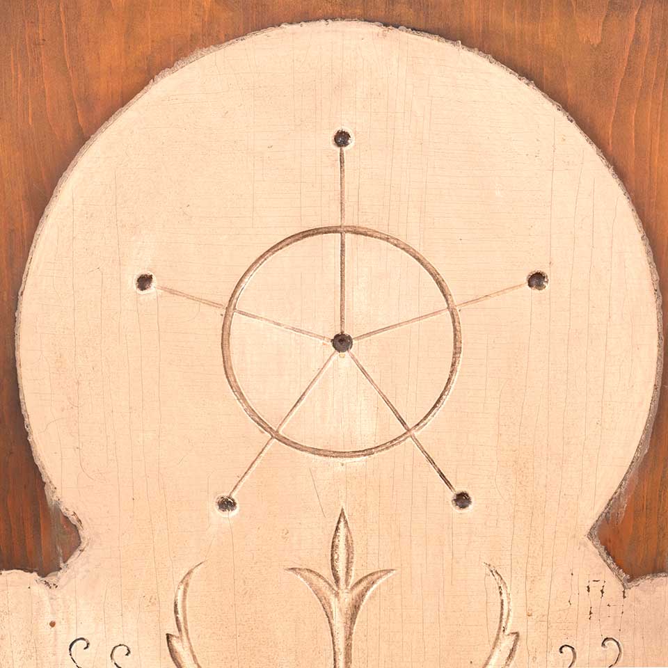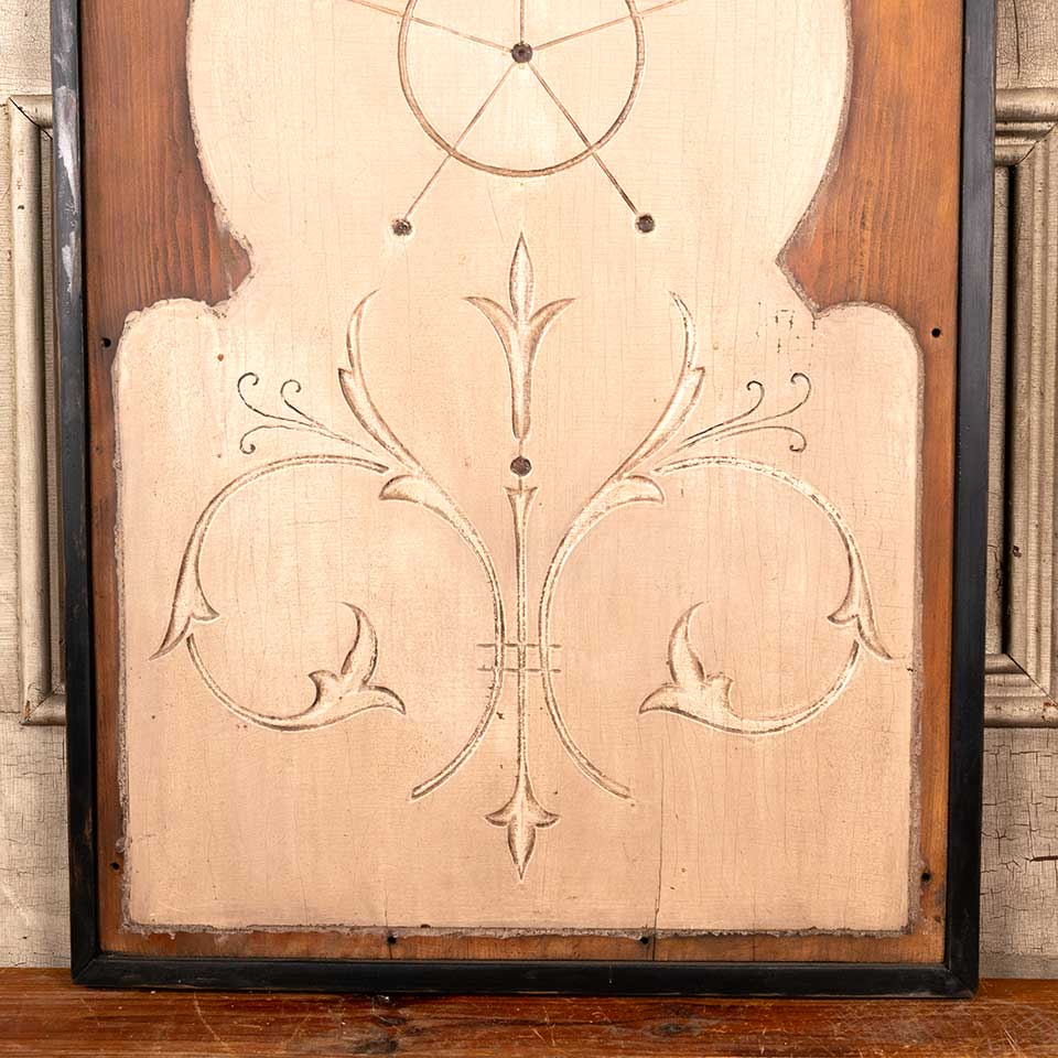 Framed antique architectural salvage ornament wall hanging measuring approx. 25 1/8" wide x 37" tall x 1 1/4" front to back. See photos to evaluate condition.