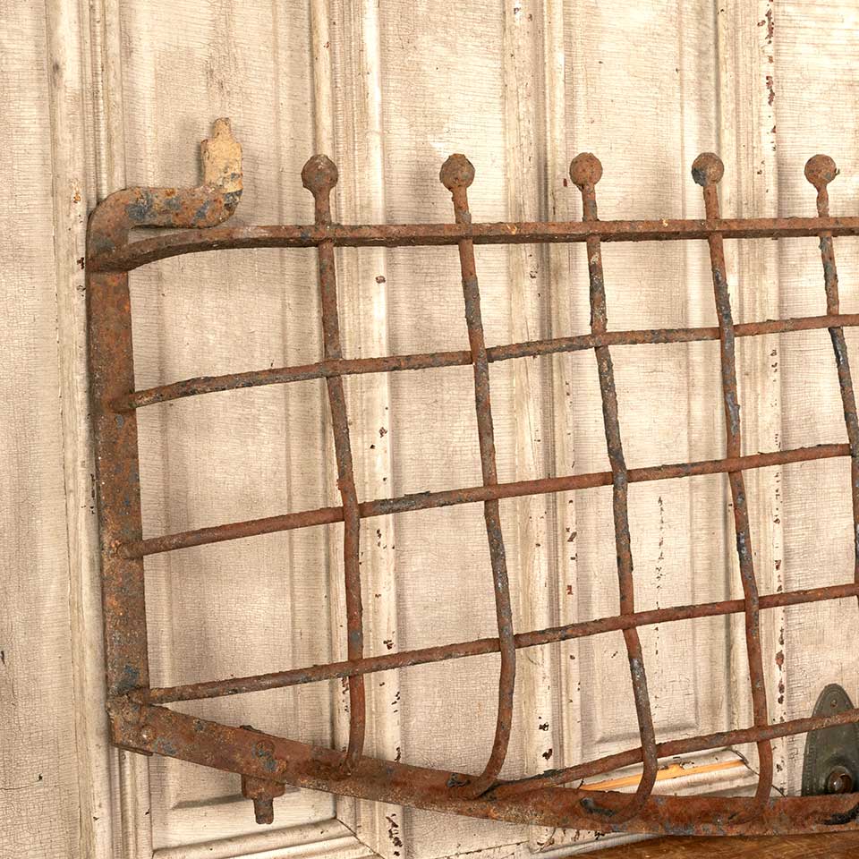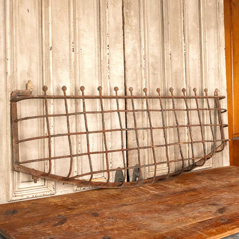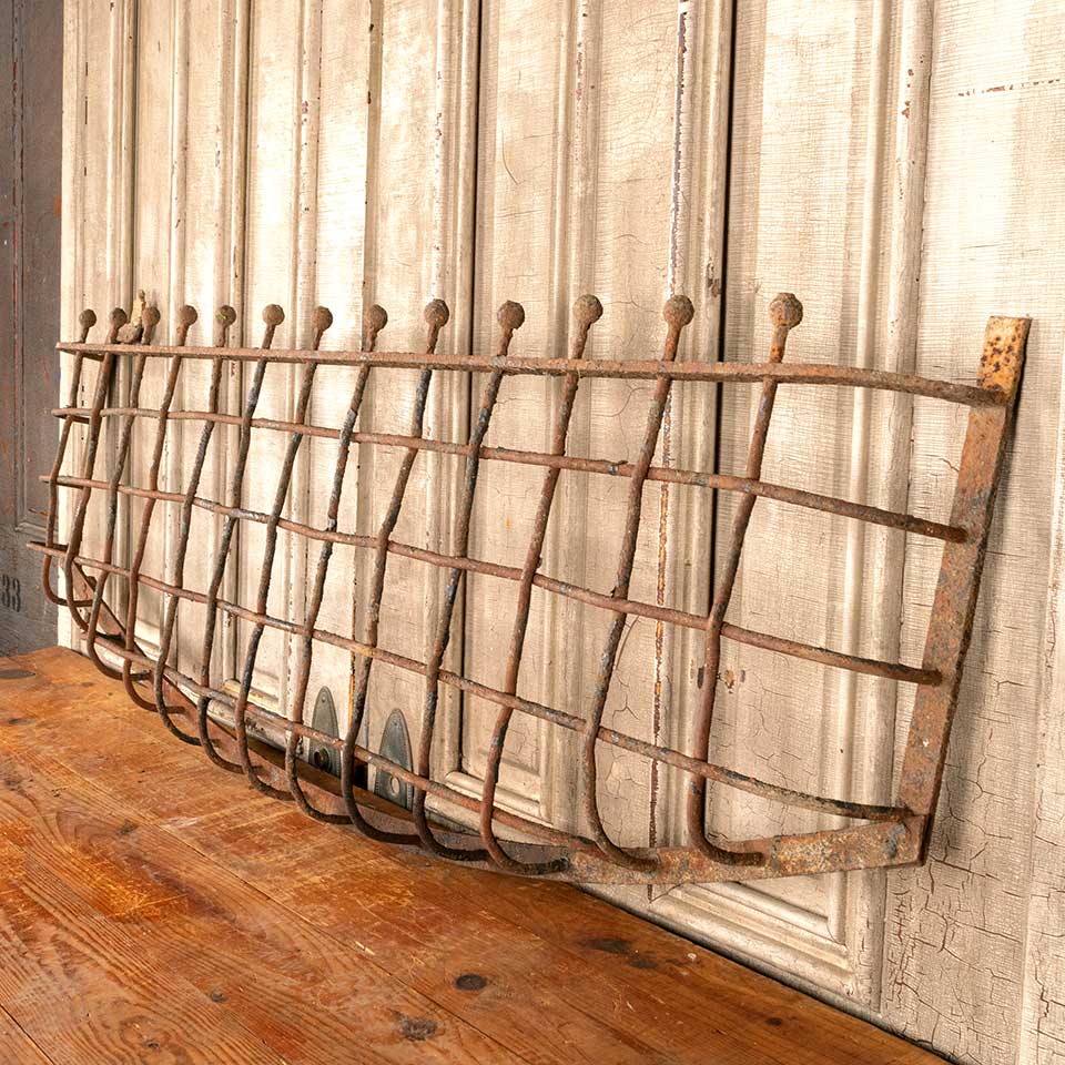 Architectural salvage antique wrought iron window grate cover measuring approx. 61" wide x 21" tall x 4" front to back. See photos to evaluate condition.